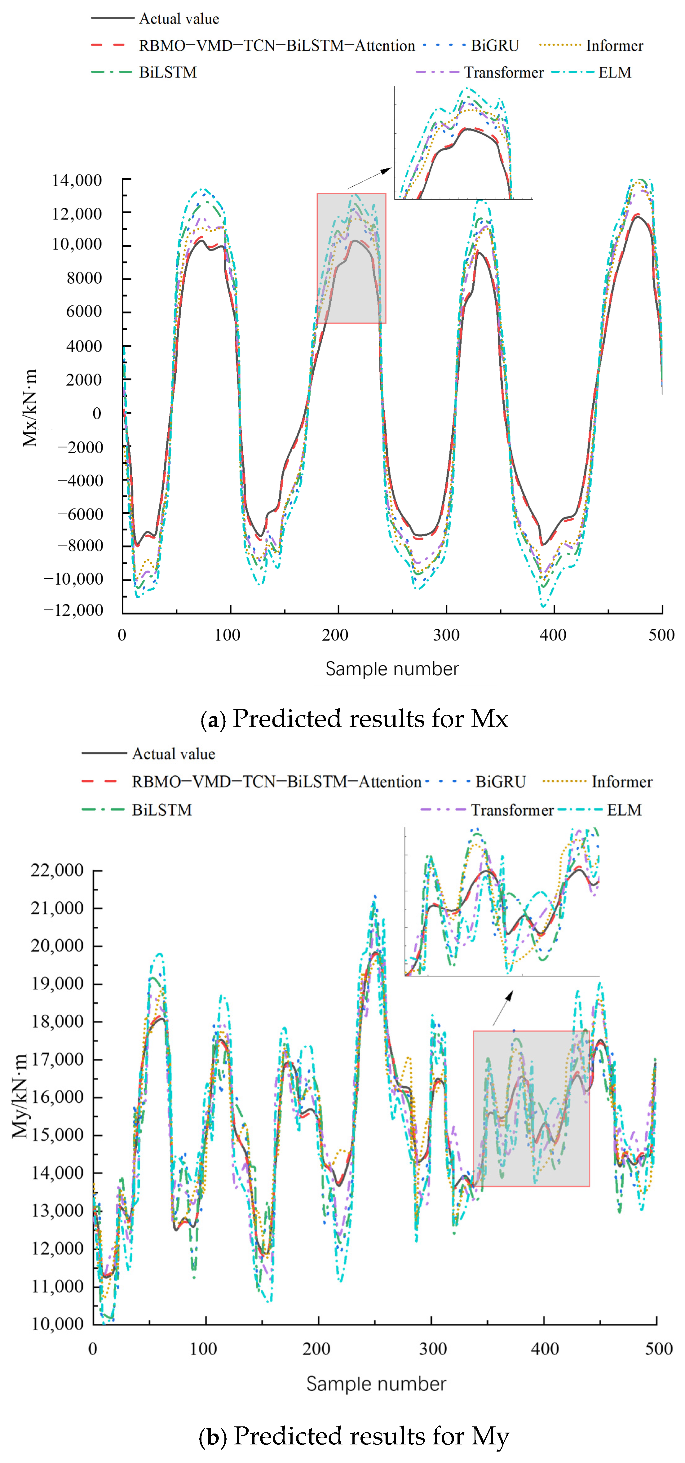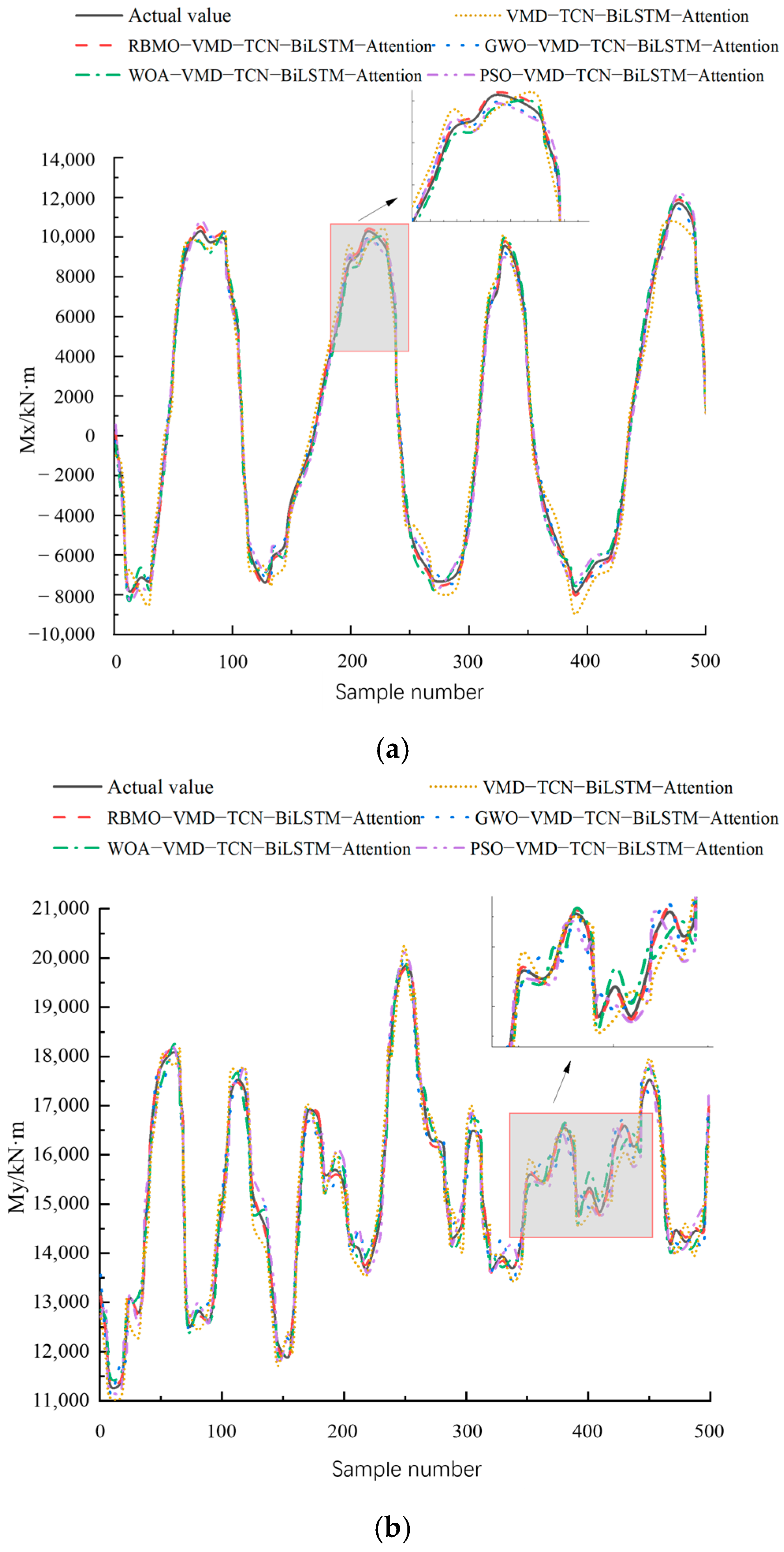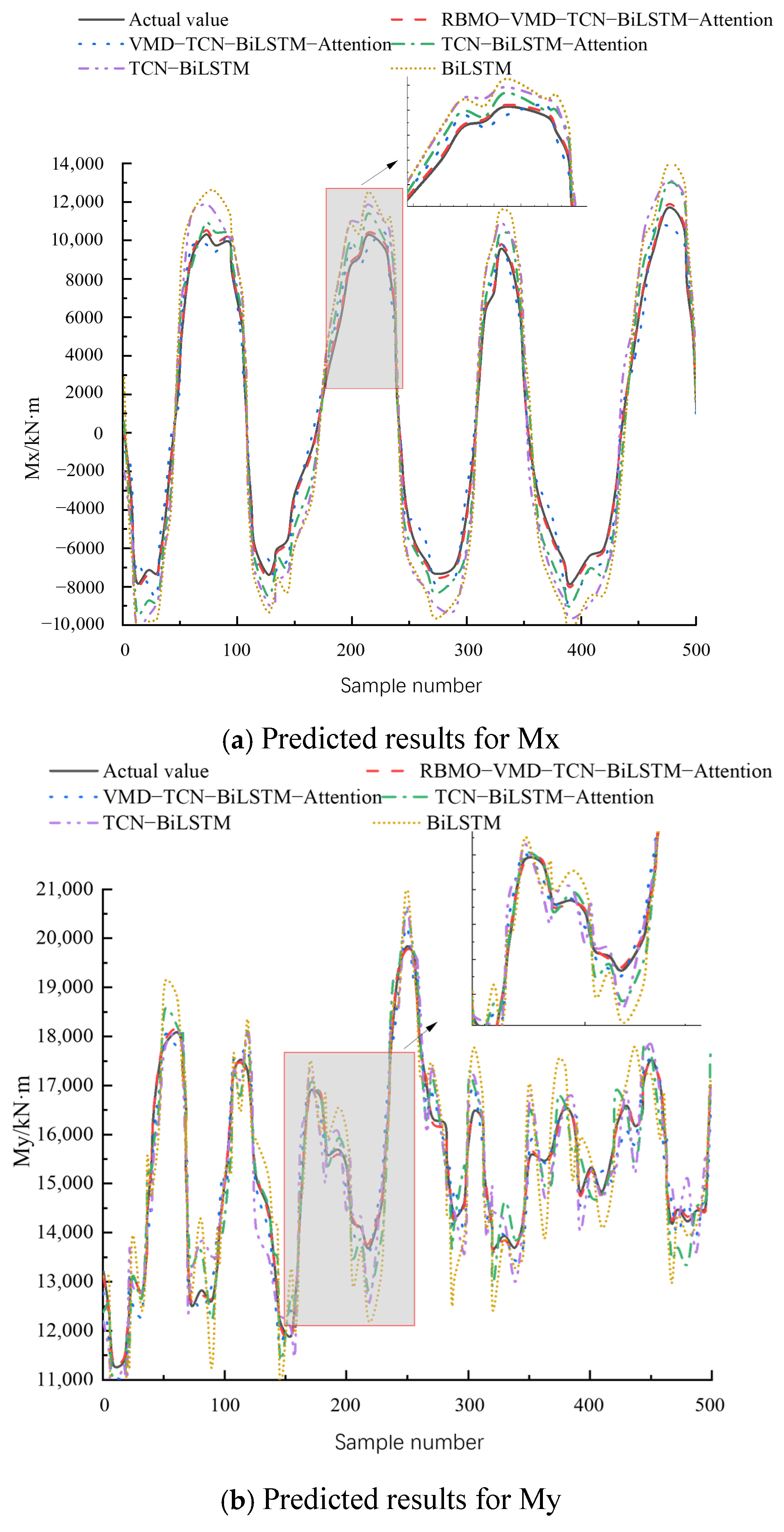 - To further enhance the prediction accuracy of blade root loads in wind turbines, the RBMO algorithm was employed to optimize the parameters of the VMD and the hyperparameters of the TCN-BiLSTM-Attention model, resulting in a significant improvement in prediction accuracy. Experiments demonstrate that the combined prediction model based on RBMO-VMD and TCN-BiLSTM-Attention achieves high prediction accuracy.