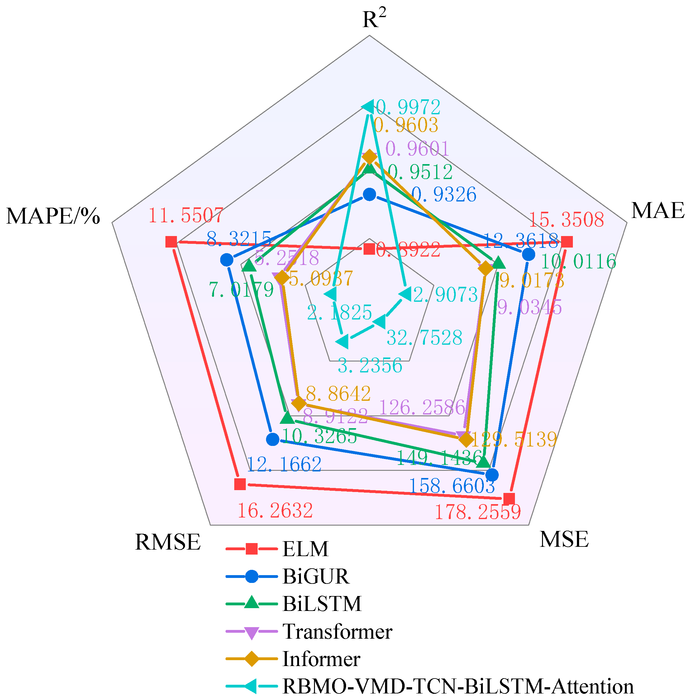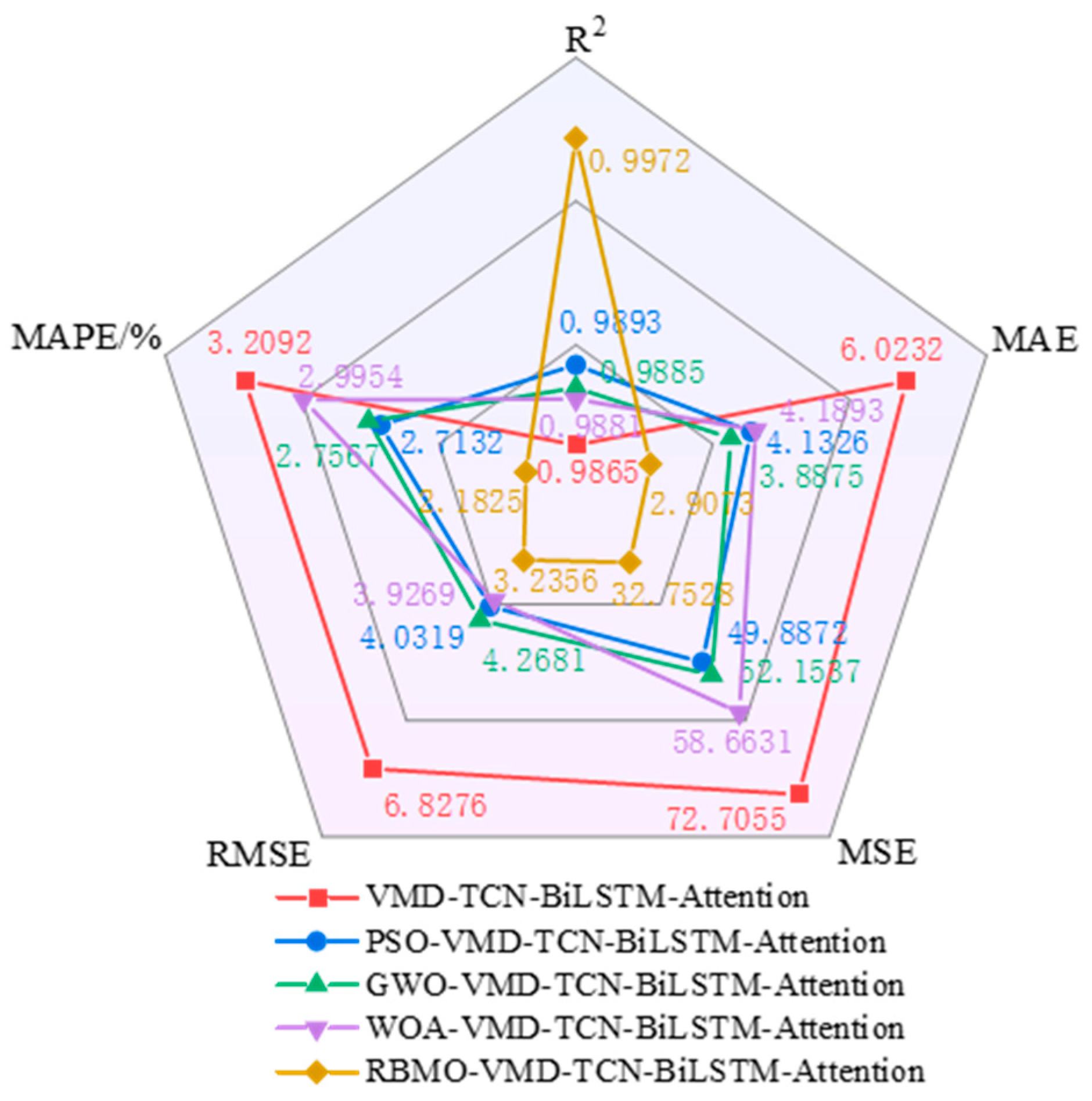 | RBMO-VDM-TCN- BiLSTM-Attention | 0.9972 | 2.9073 | 32.7528 | 3.2356 | 2.1825 |