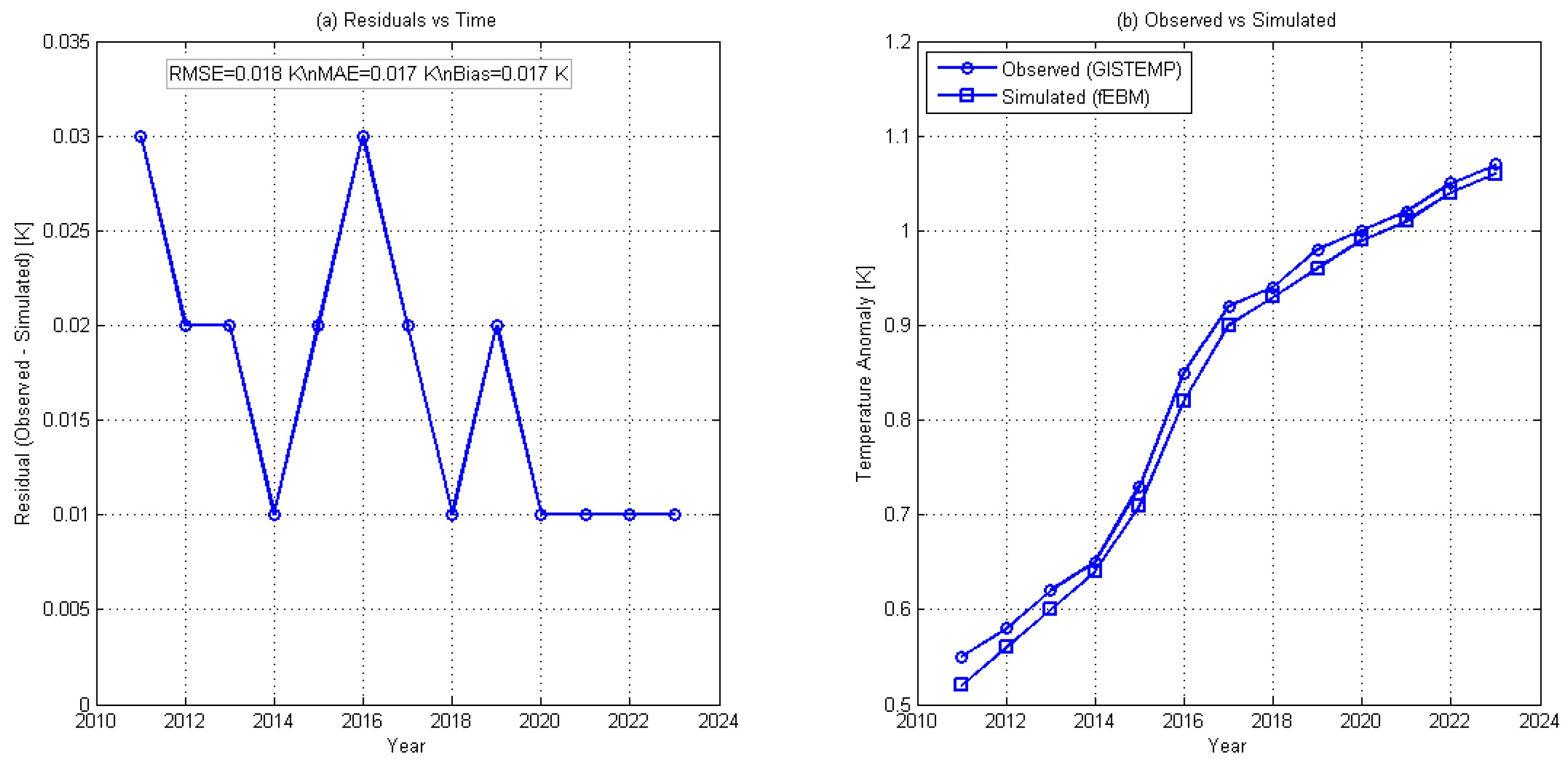 The physical coherence of the optimized parameters reinforces the fEBM as a structurally sound, parsimonious representation of global climate dynamics, bridging the gap between simple exponential models and computationally expensive Earth-system models.