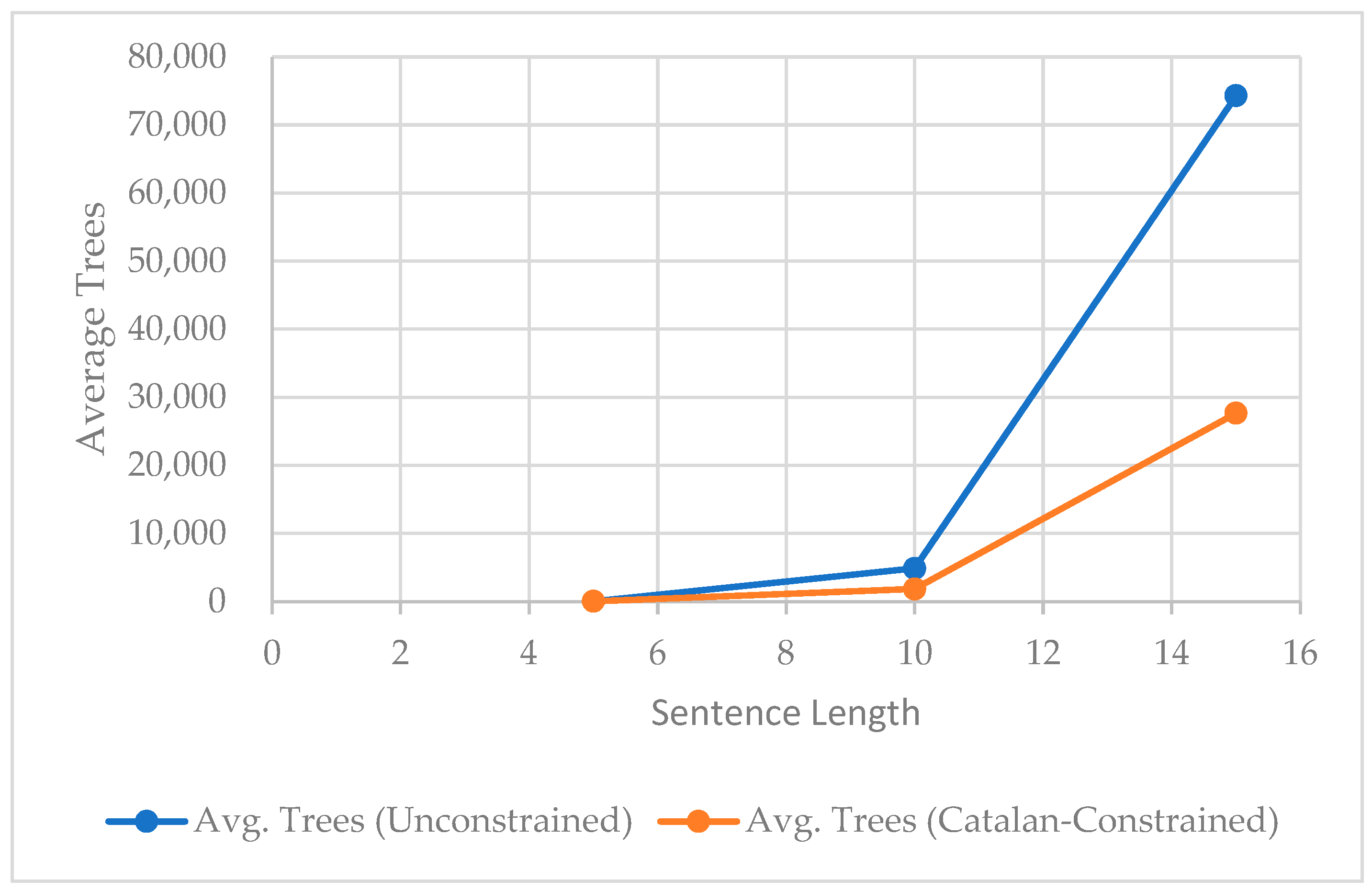 Figure 2, the unconstrained grammar rapidly exhibits exponential growth jumping from fewer than 5000 trees at length 10 to over 75,000 at length 15 while the Catalan-constrained model grows much more slowly over the same interval. This divergence demonstrates that the proposed combinatorial constraints scale favorably, especially for longer inputs where grammar induction traditionally becomes computationally intractable. The empirical curves closely track the theoretical behavior of Catalan versus restricted Catalan families, confirming that combinatorial bounding effectively suppresses structural overgeneration without sacrificing linguistic coverage.