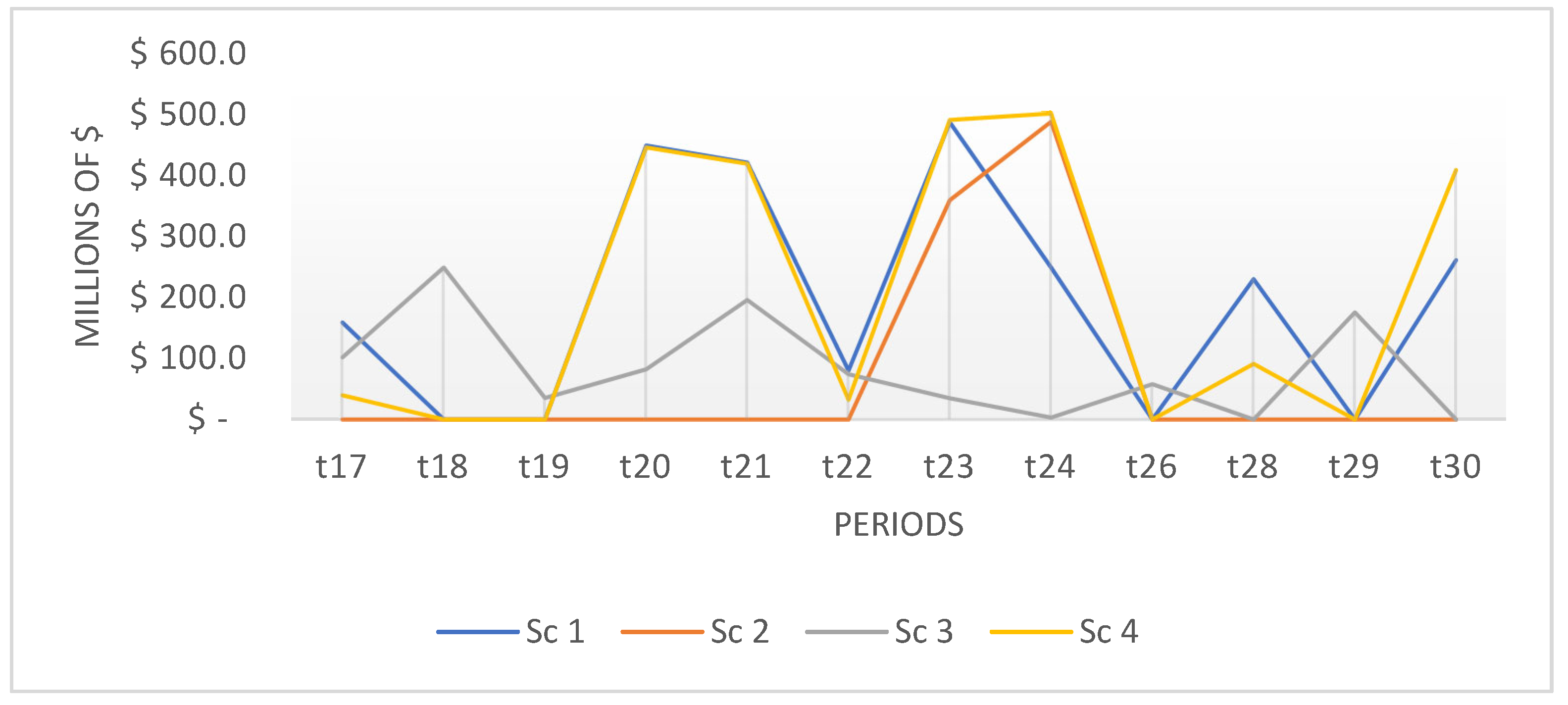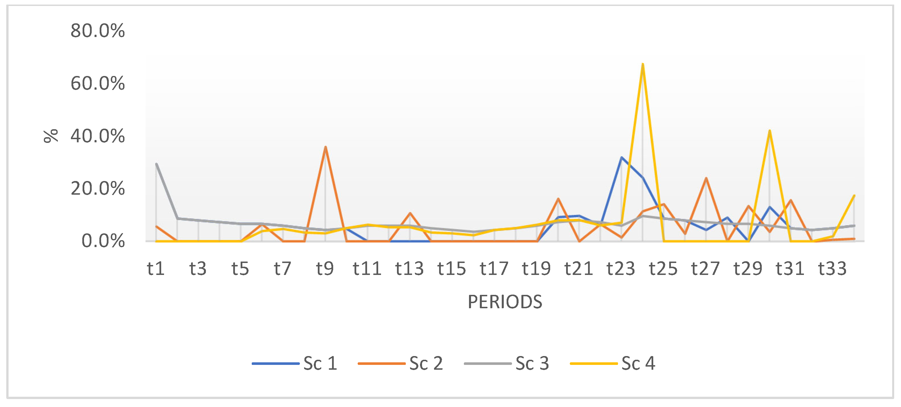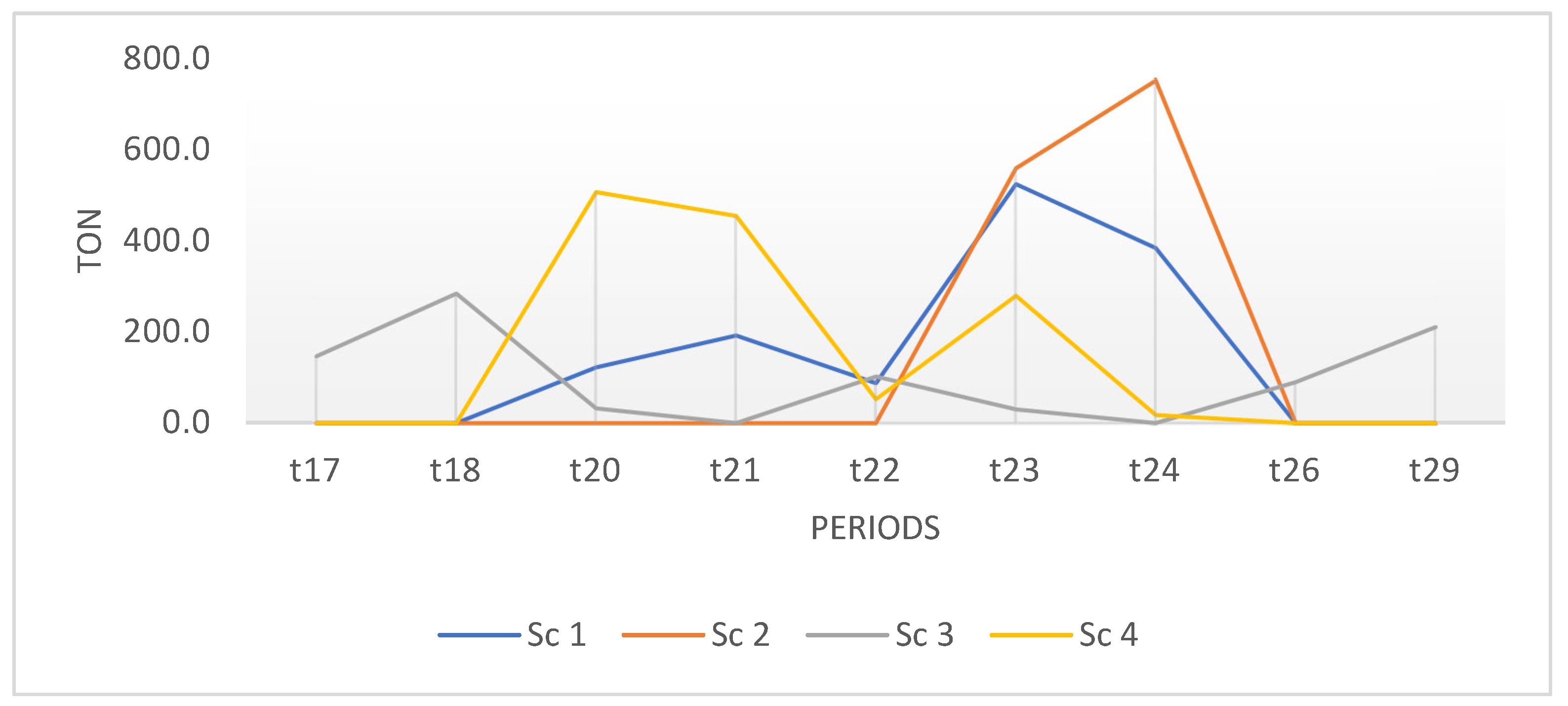 To analyze the temporal behavior and operational feasibility of the solution obtained through the fuzzy approach implemented in this study, the evolution of key decision variables was graphically examined over the planning horizon under the different scenarios considered.