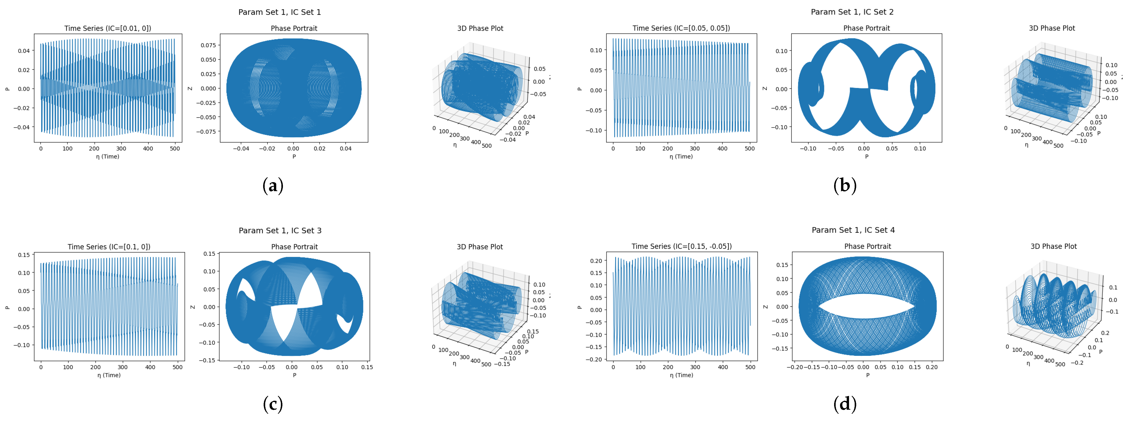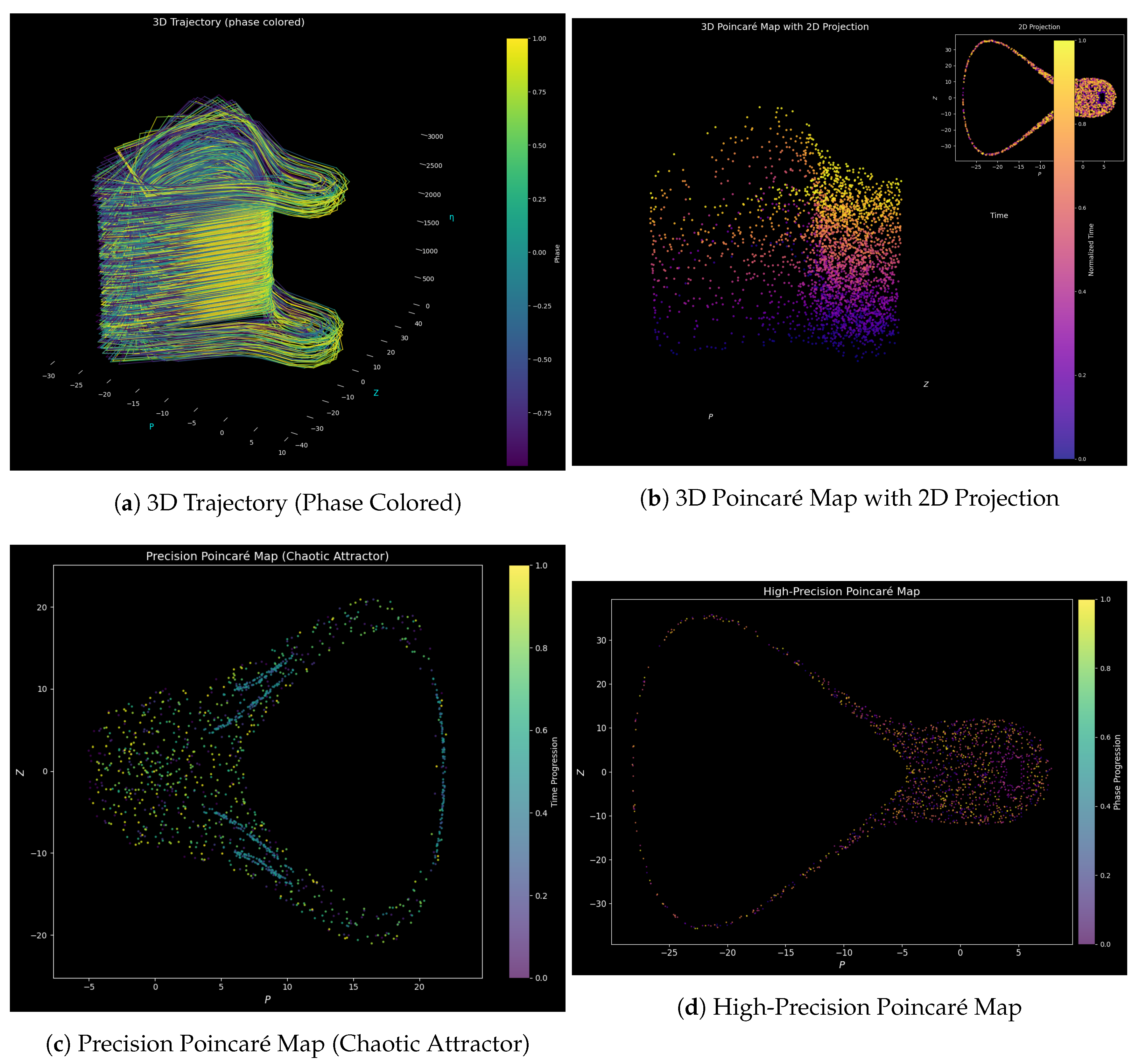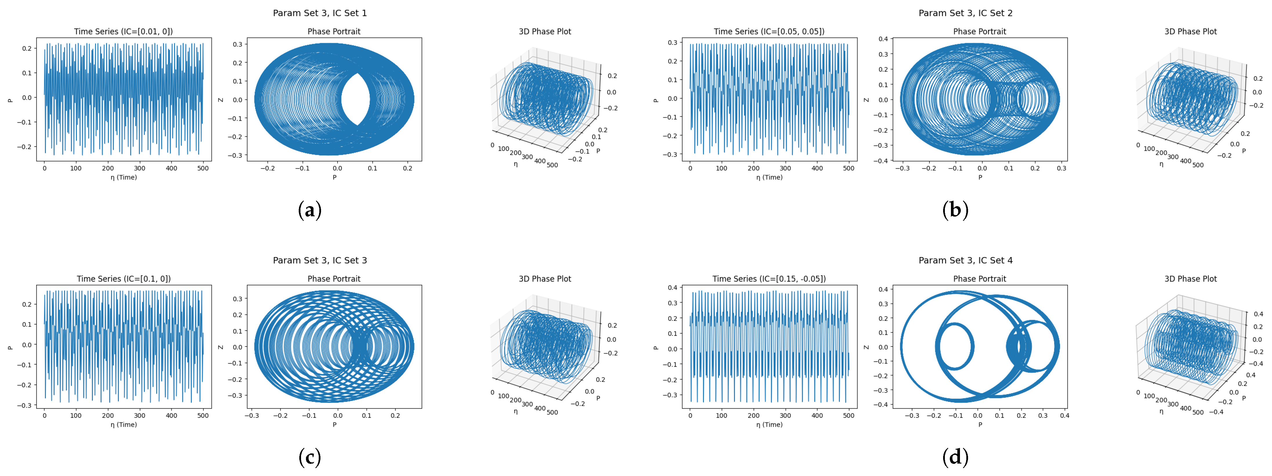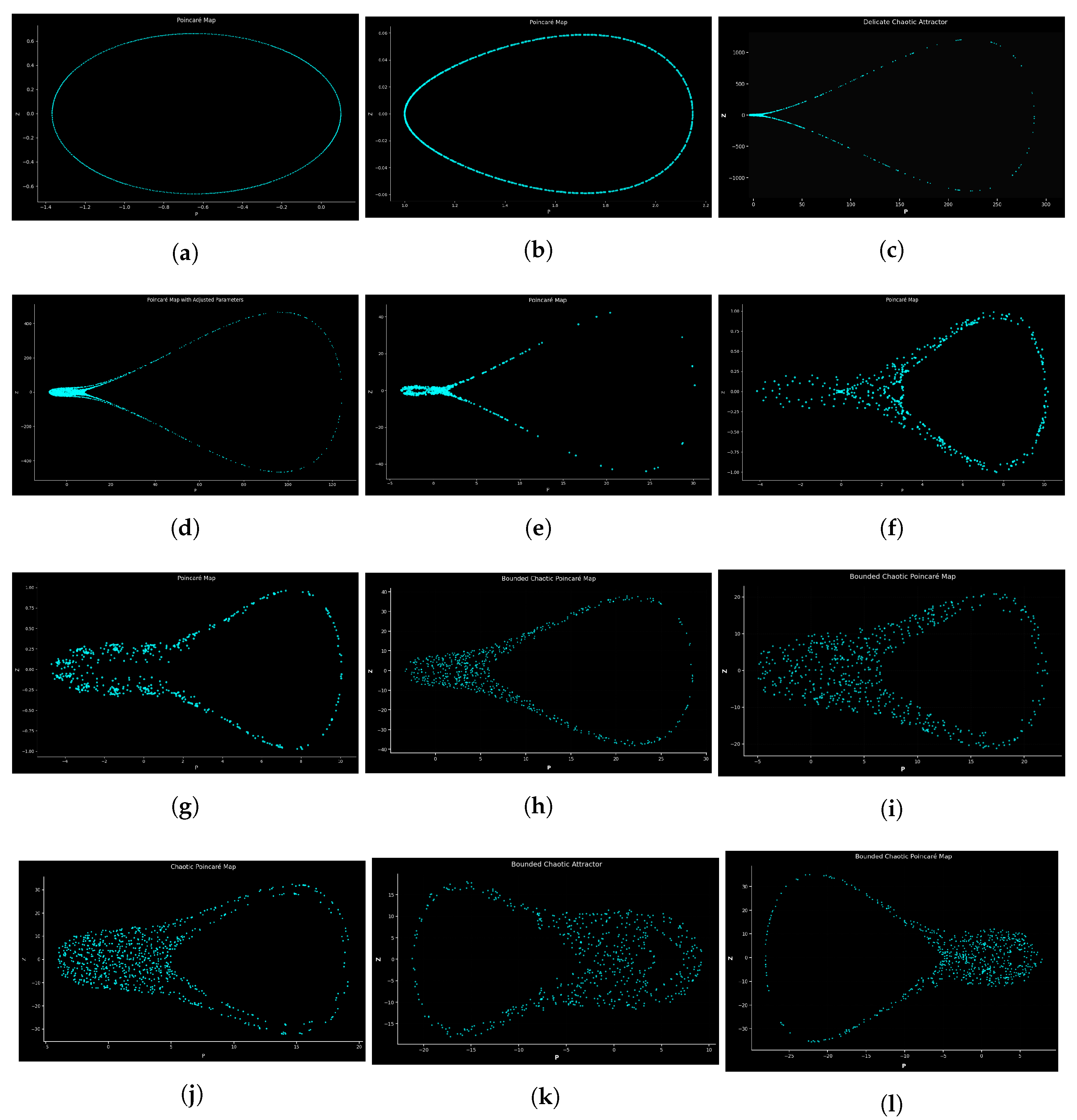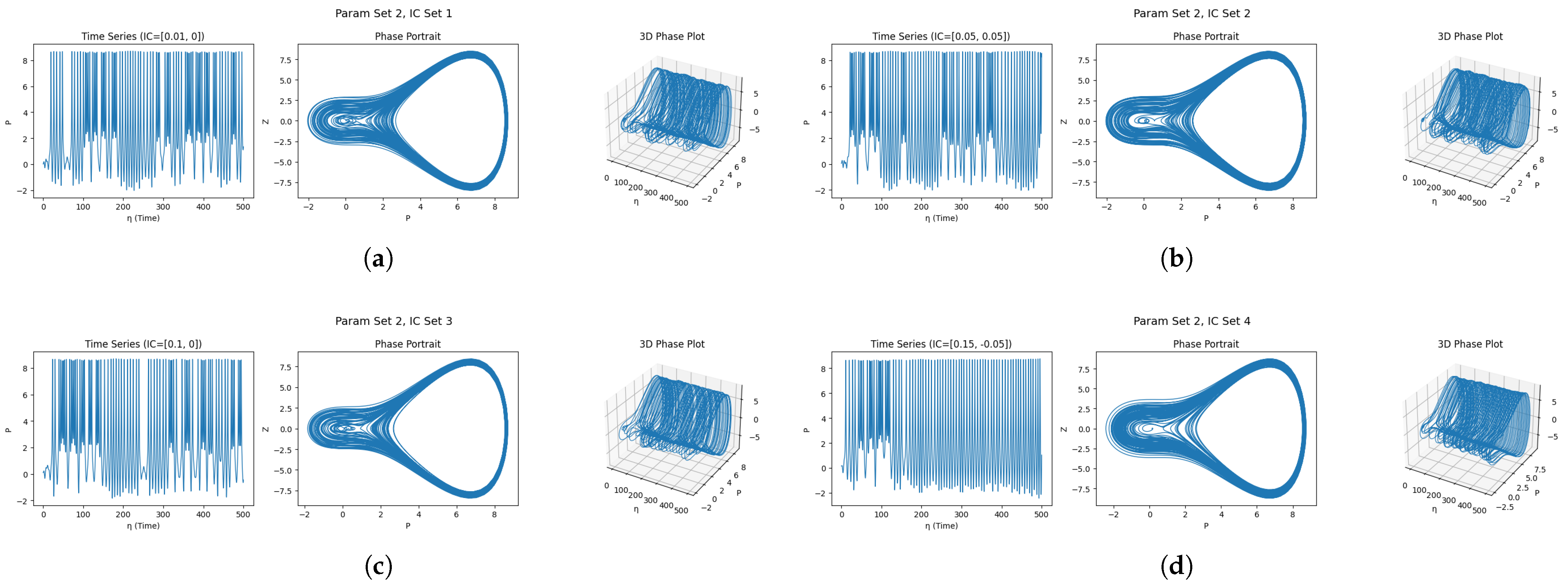 3.8. Analysis of Lyapunov Exponents and Phase Portraits