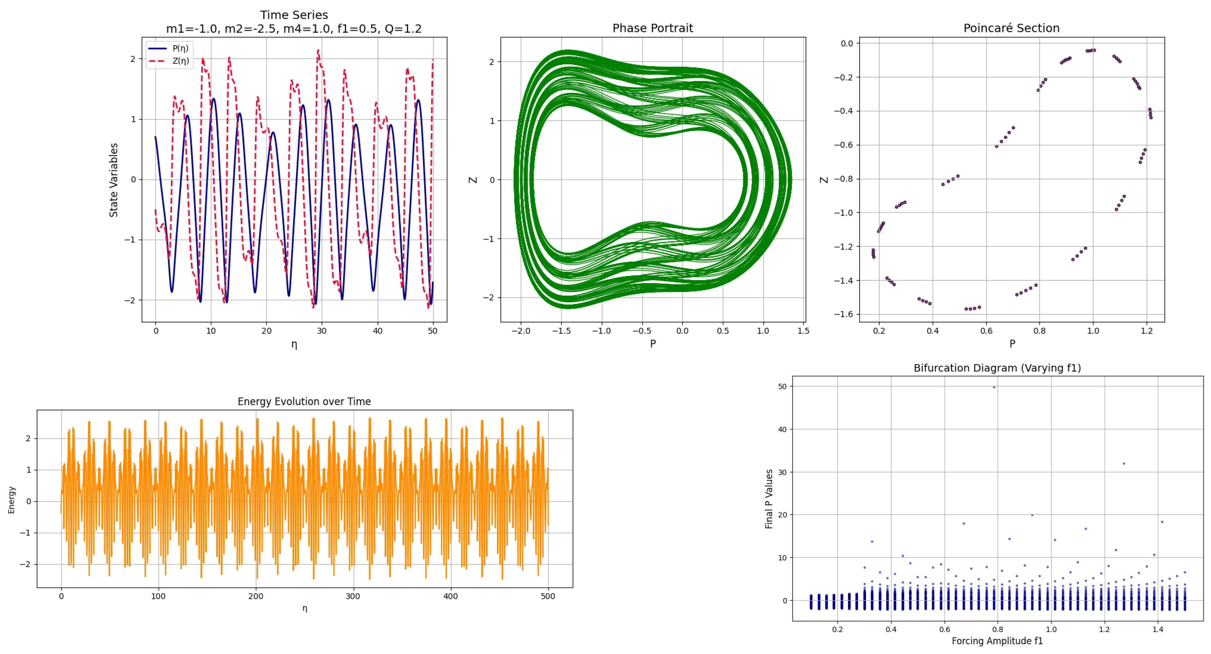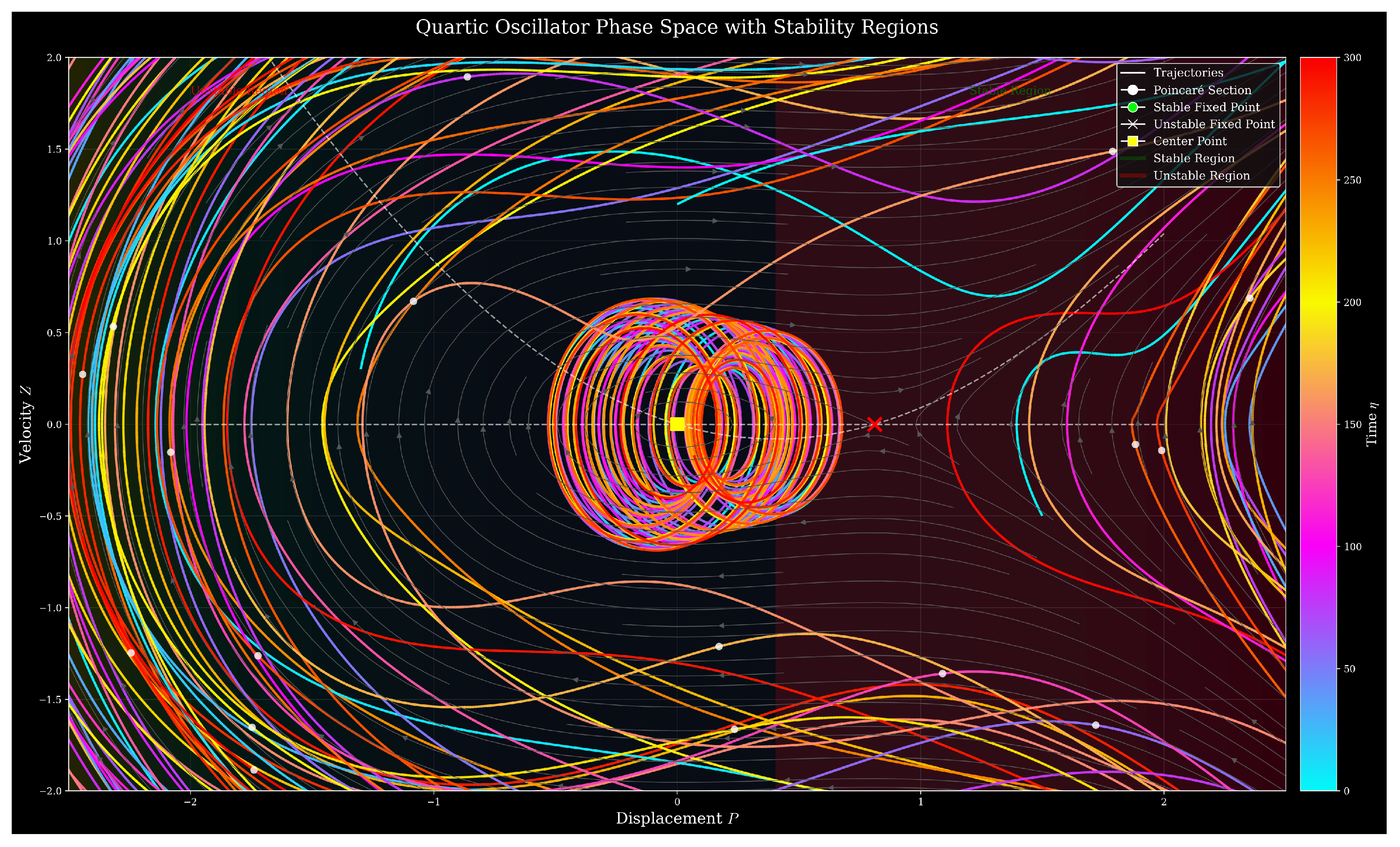 , showing the complex geometry of the stability state of the system using trajectories of several different initial conditions. The fixed points are systematically categorized into the stable (blue), unstable (red), and saddle/neutral (green) types and provide a major landmark in learning about the equilibrium structures. The potential landscape is mapped out with the help of the nullclines and contour lines, and the areas of local stability (dark partially shaded) and instability (bright partially shaded) are obtained, which point to the bounded and divergent, dynamics respectively. The use of Poincaré sections, illustrated by the white stroboscopic, assists in distinguishing between periodic, quasi-periodic, and chaotic regimes, while color-coded time-dependent development of the orbits captures the time-varying development of trajectories. A combination of these elements will give a complete perspective of the global dynamics of the system, along with its equilibrium structure and transient behaviors, and will provide vital information about the stability of the system and its nonlinear complexity.
