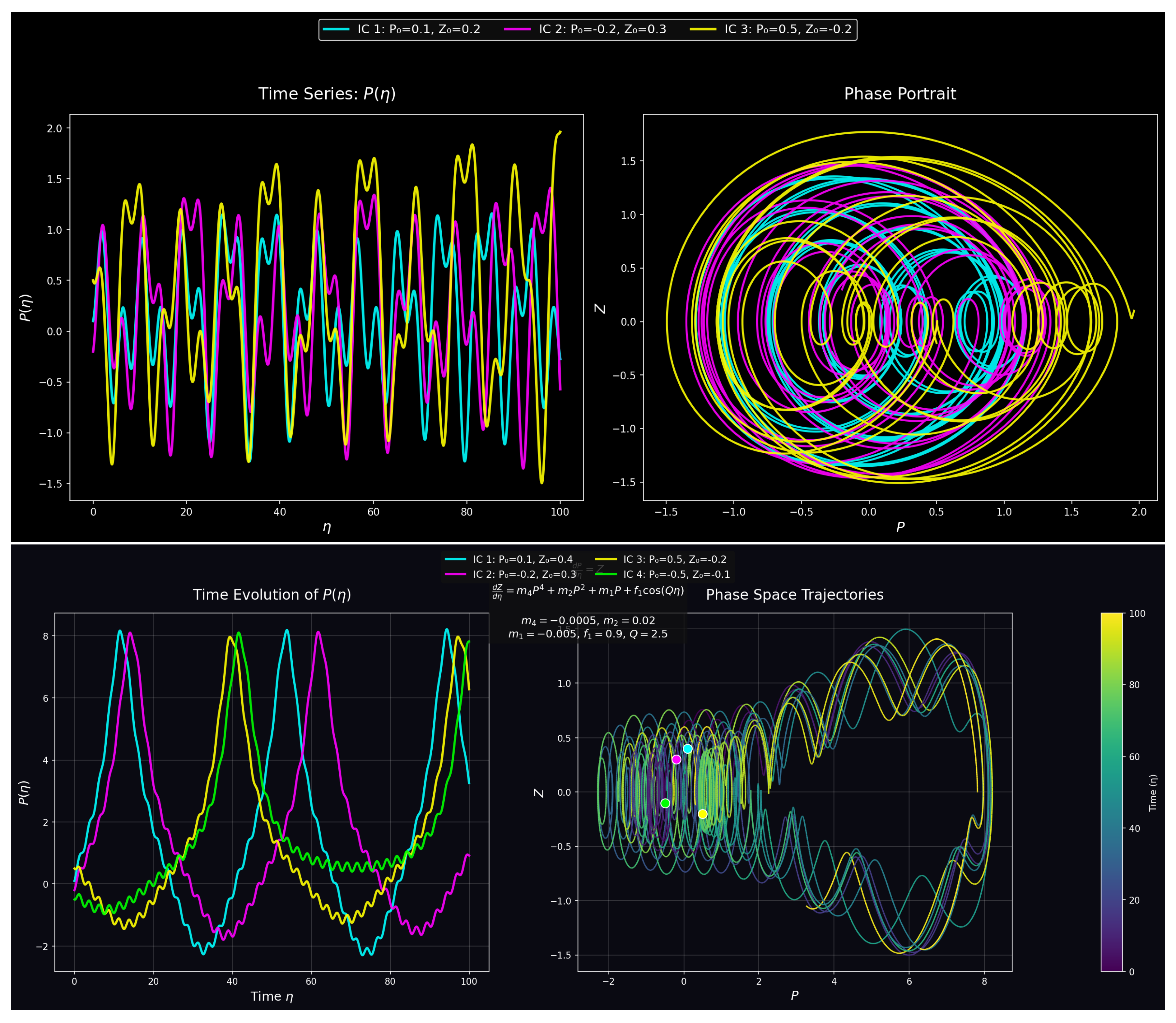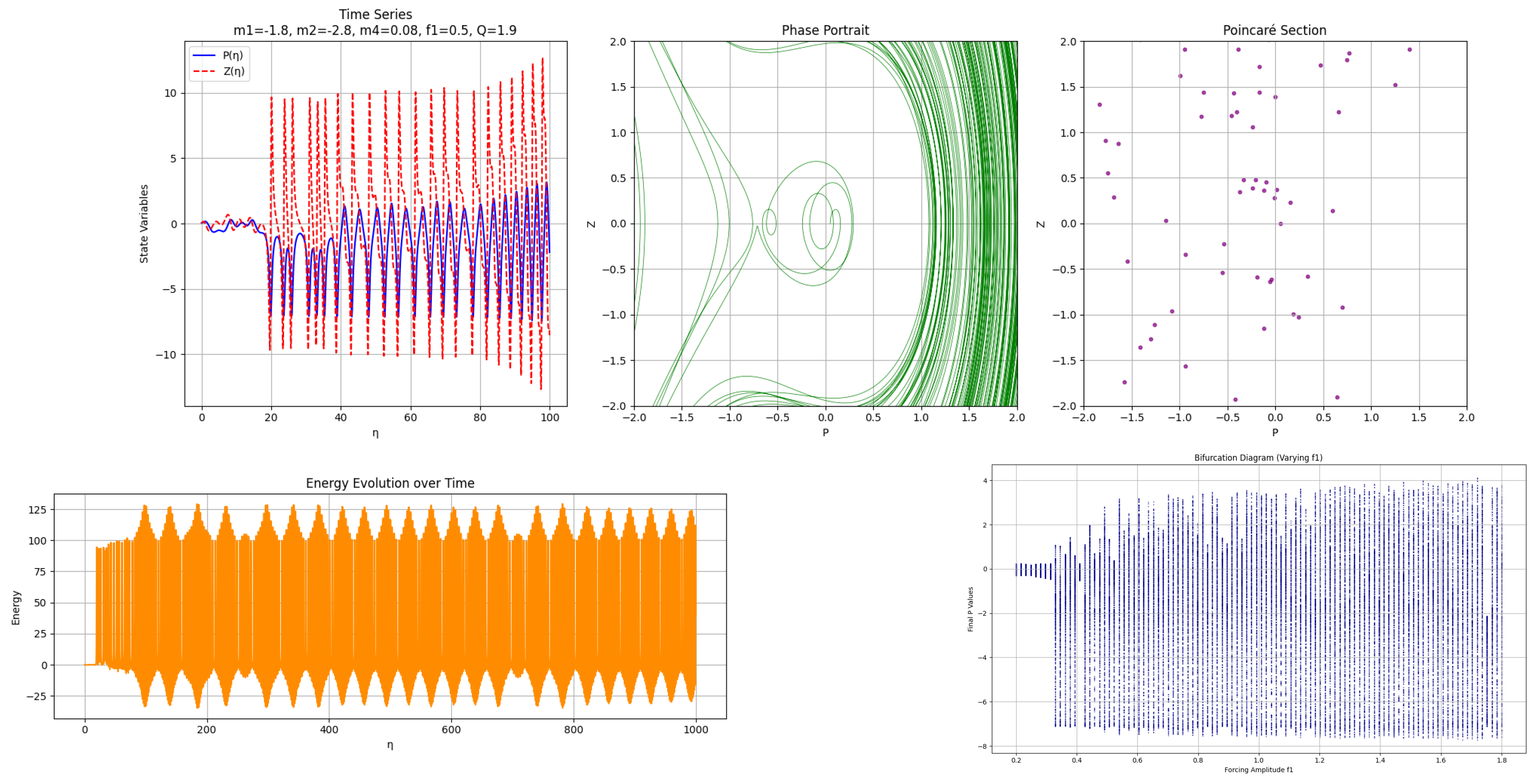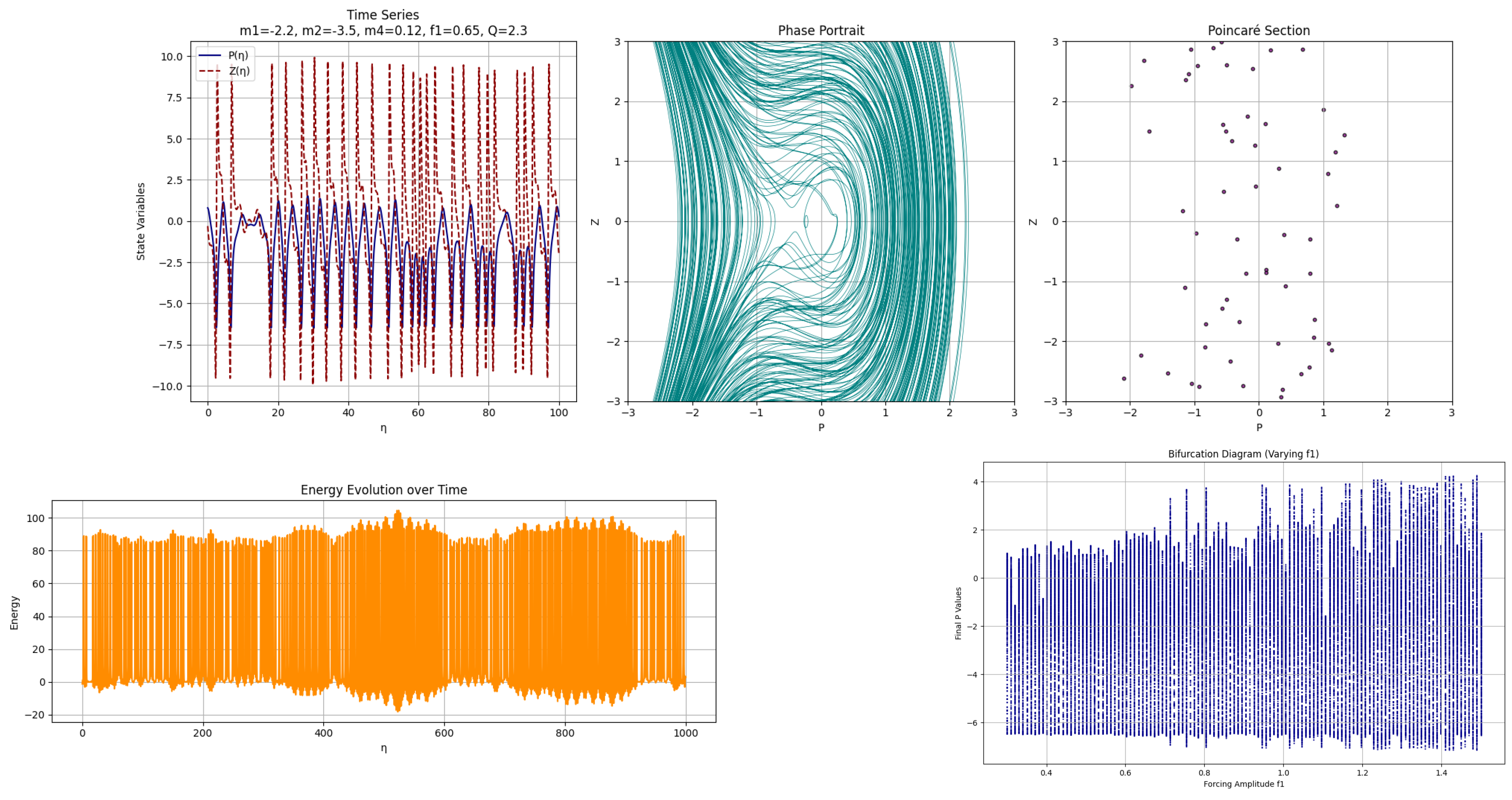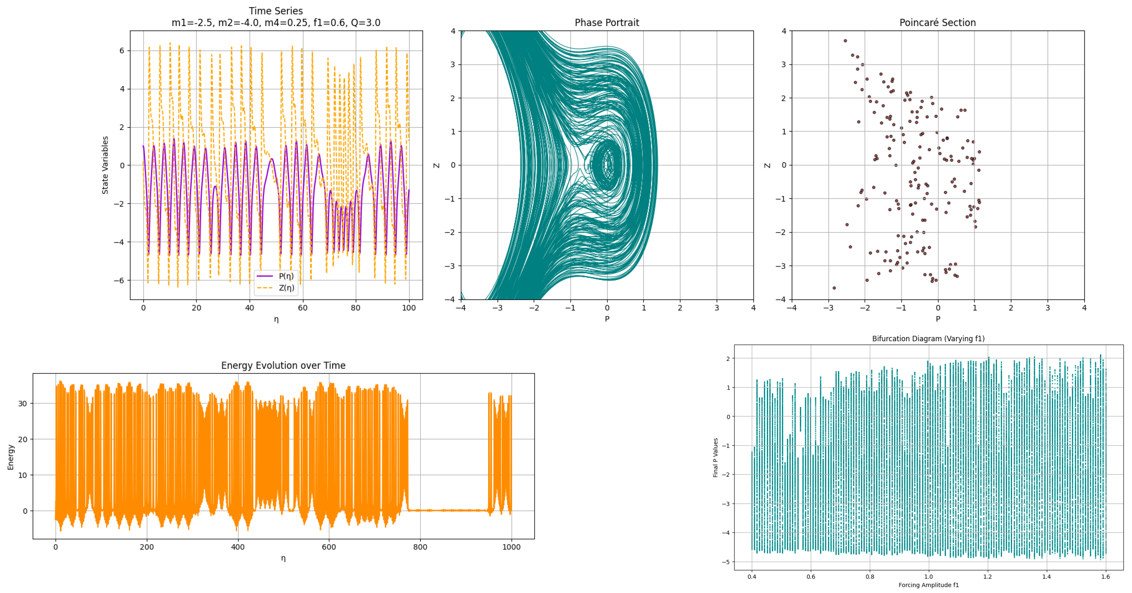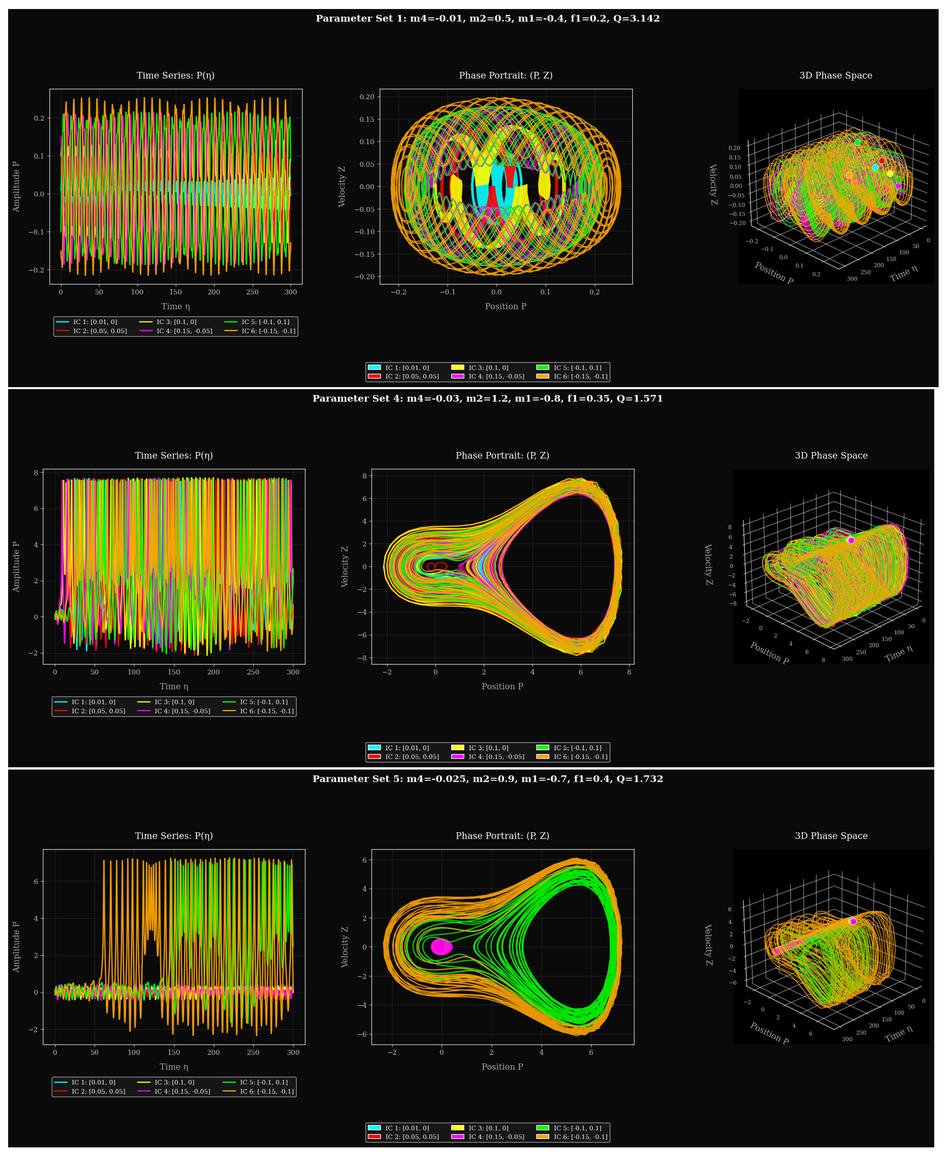 Figure 23) exhibits distinct amplitude and phase variation waveforms for identical parameter values, indicating a pronounced sensitivity to initial conditions. The corresponding phase portraits (top right) display qualitatively different loops and spiral-like structures associated with different initial conditions, suggesting the possible presence of multiple long-term dynamical states. Other trajectories (bottom left of