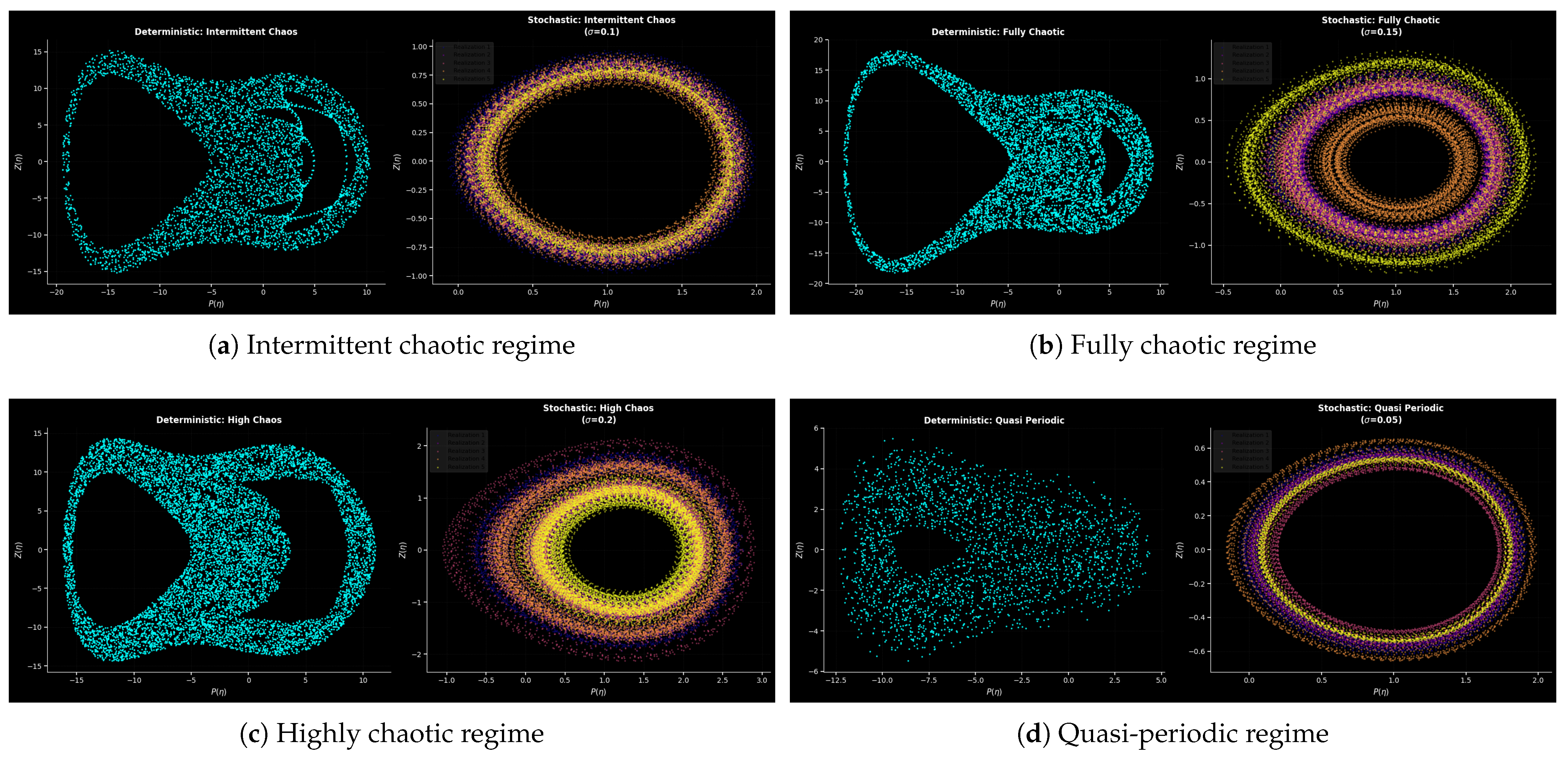 Importantly, this figure constitutes a systematic bifurcation analysis with respect to the noise strength , directly addressing the role of stochastic forcing as a control parameter. By explicitly varying and constructing a stochastic bifurcation diagram based on ensemble-averaged long-term dynamics, the analysis demonstrates that noise neither suppresses nor enhances chaos within the explored parameter regime. Instead, it establishes that the underlying deterministic attractor remains intact, thereby distinguishing noise-modulated dynamics from genuine noise-induced bifurcation phenomena. This result clarifies the influence of stochastic excitation and confirms that, for the present system, noise primarily affects quantitative fluctuations without altering the qualitative dynamical structure.