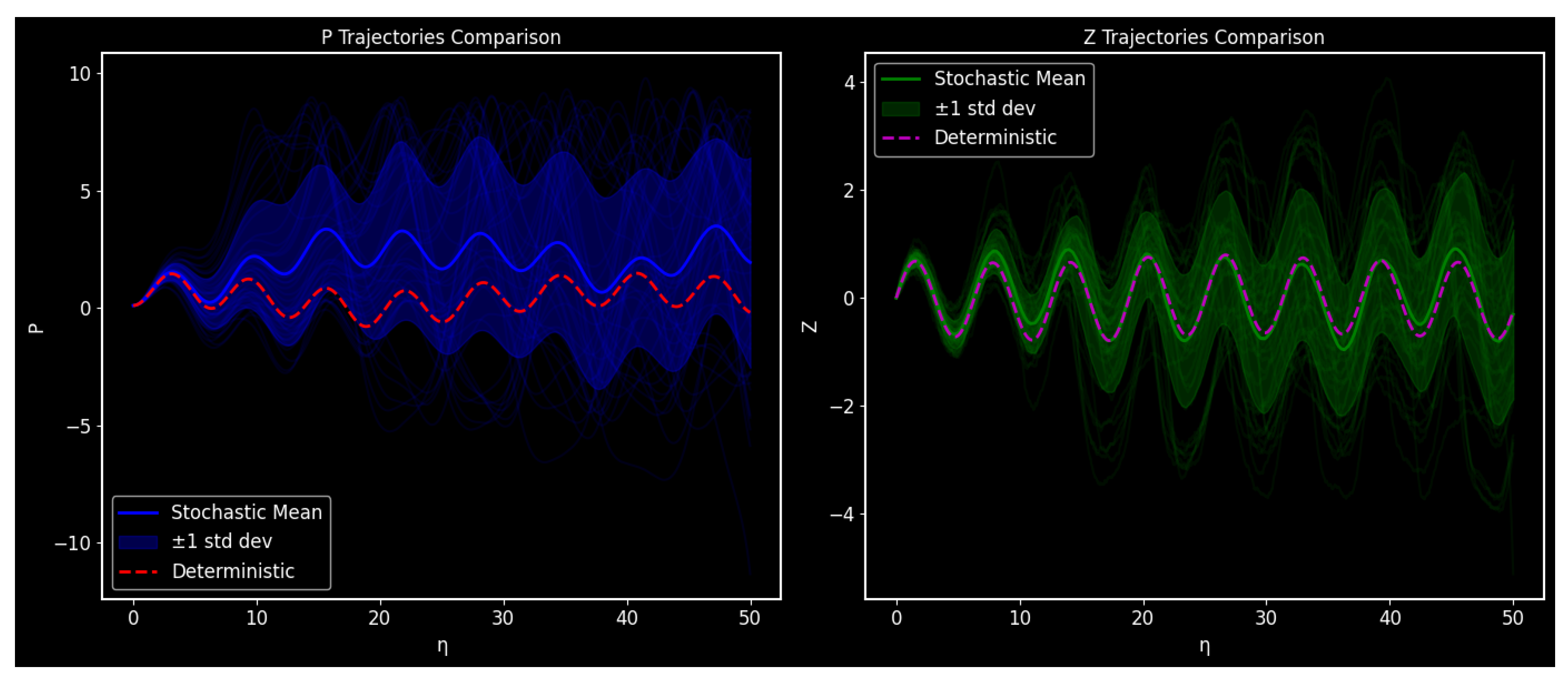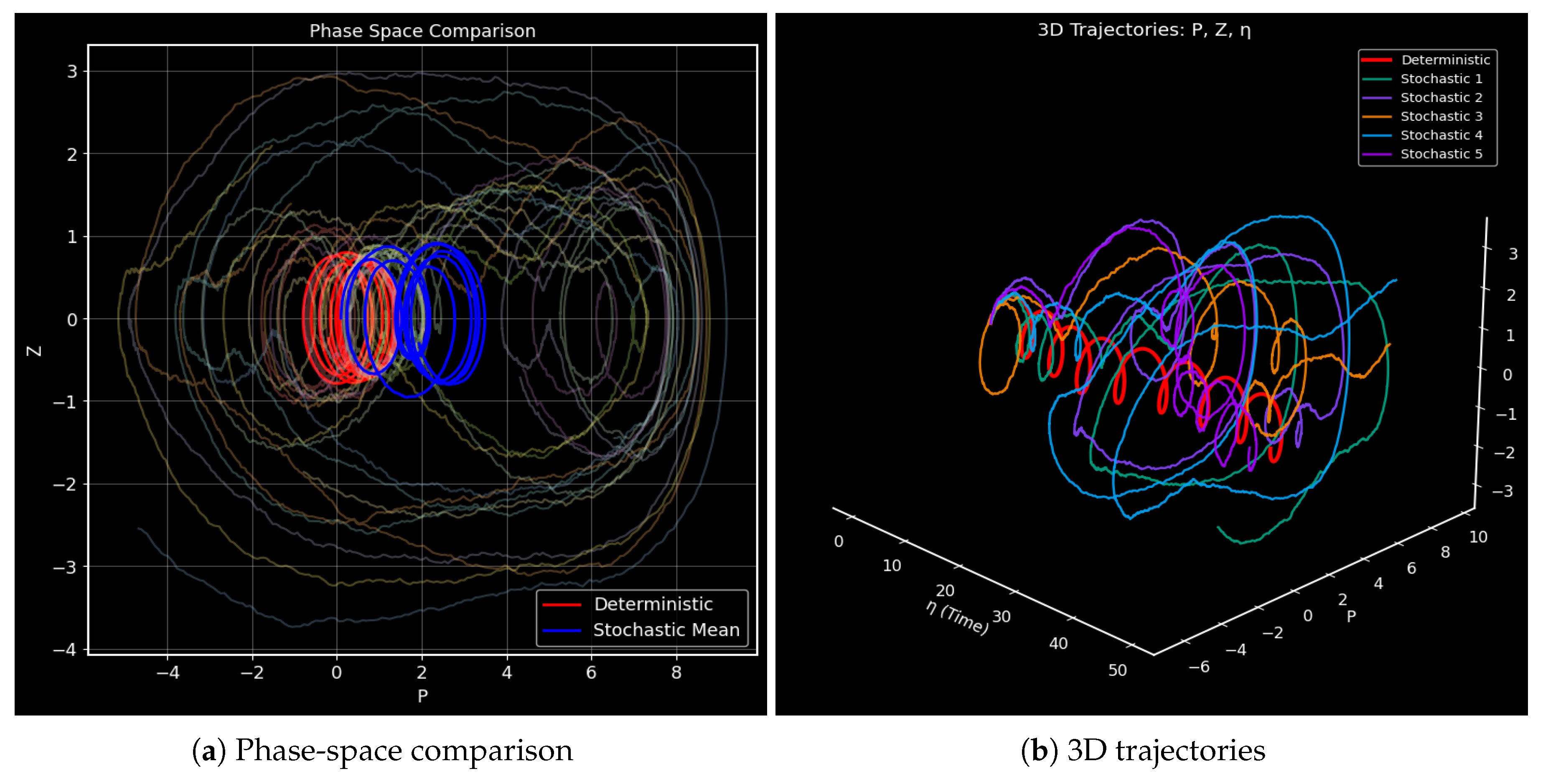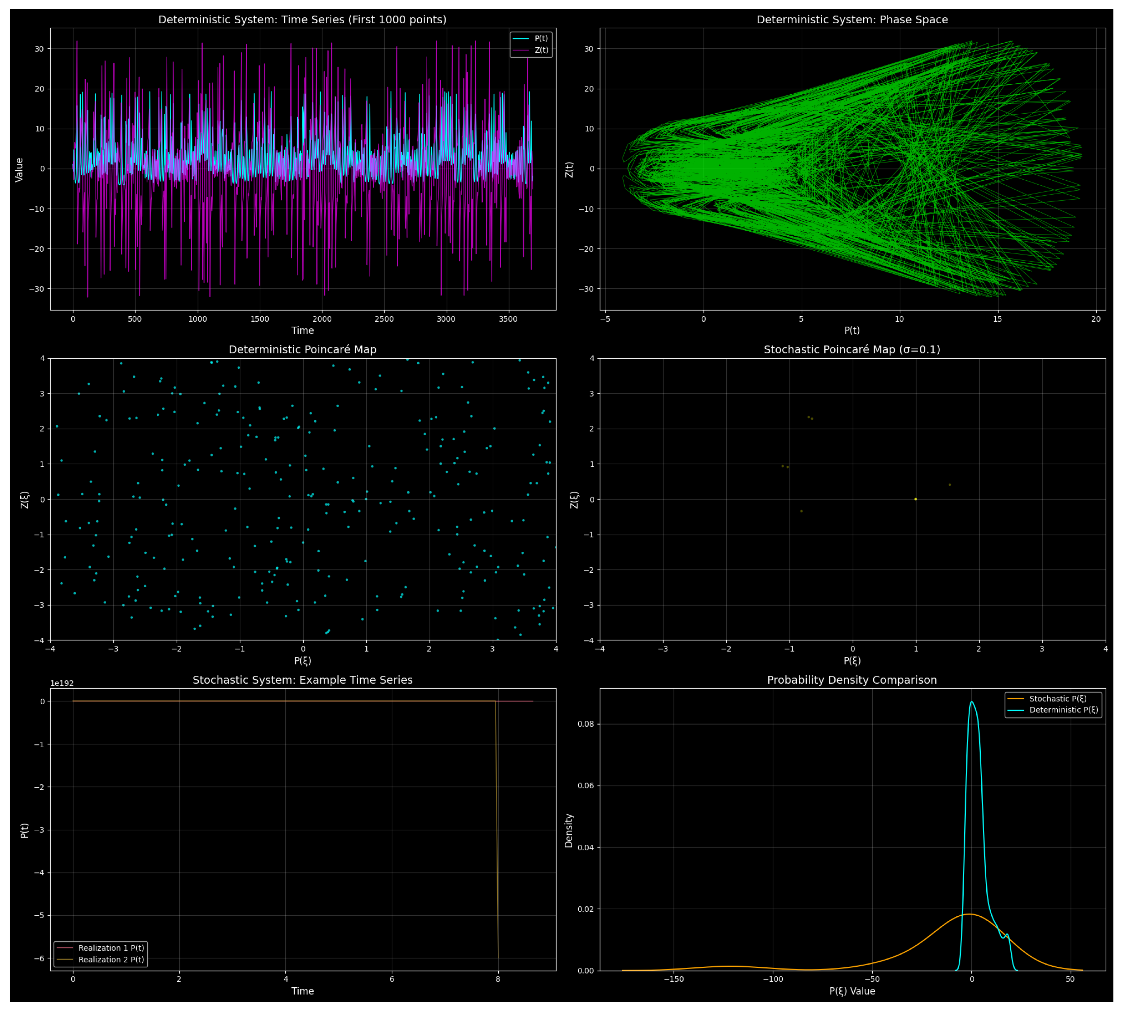 Figure 21 reveals fundamental differences between deterministic and stochastic dynamics. The deterministic system exhibits chaotic behavior with a positive Lyapunov exponent (