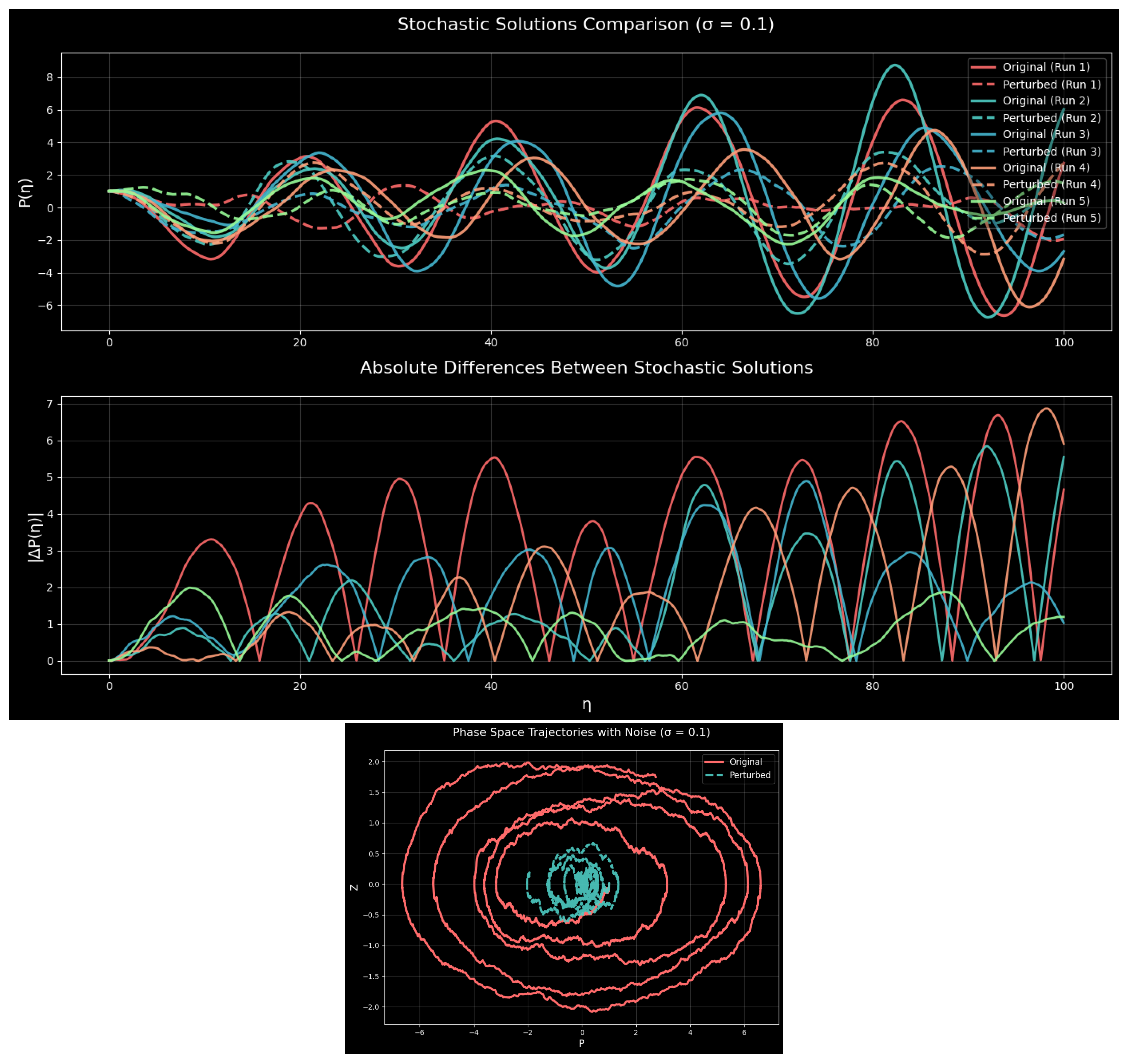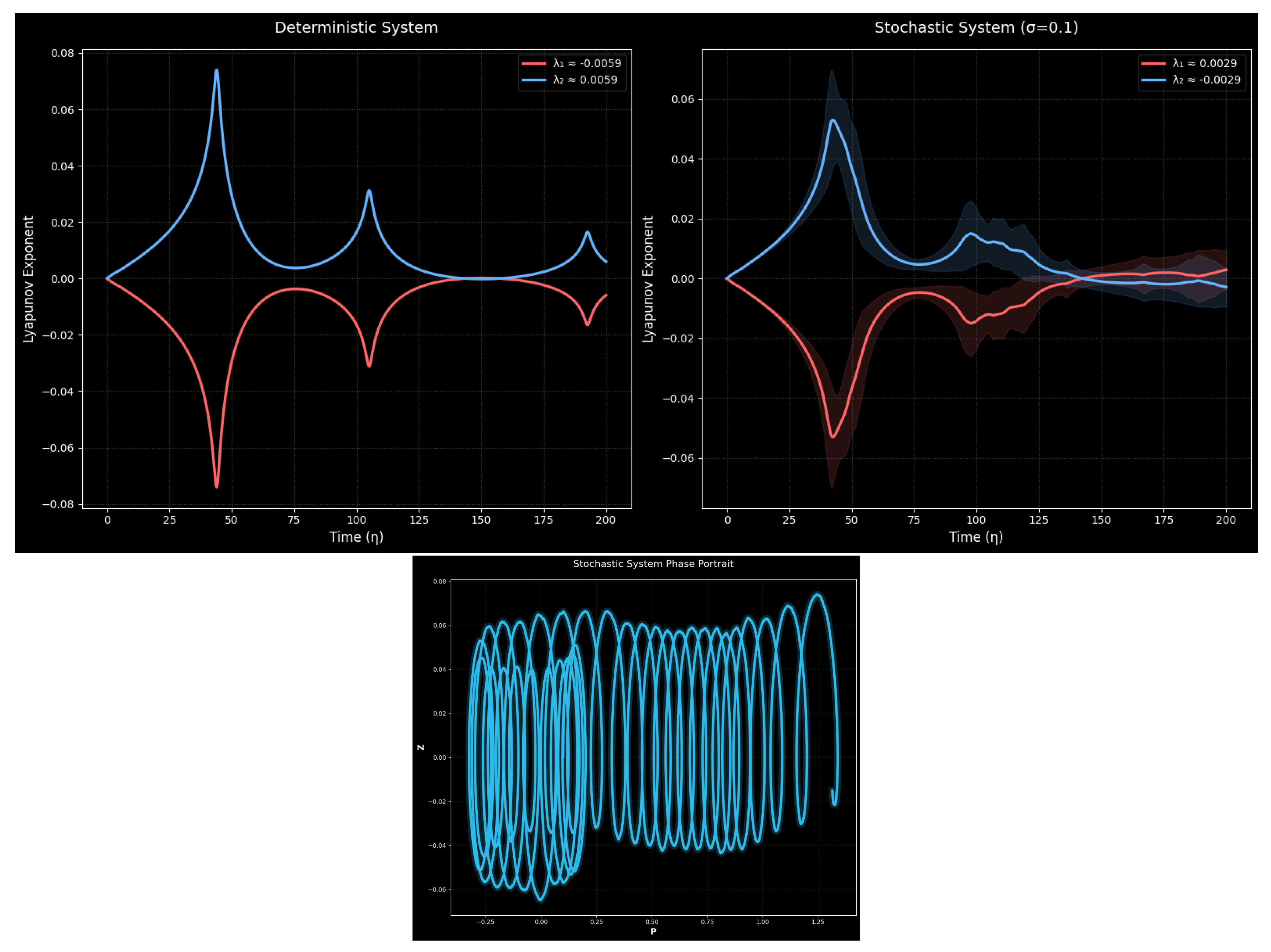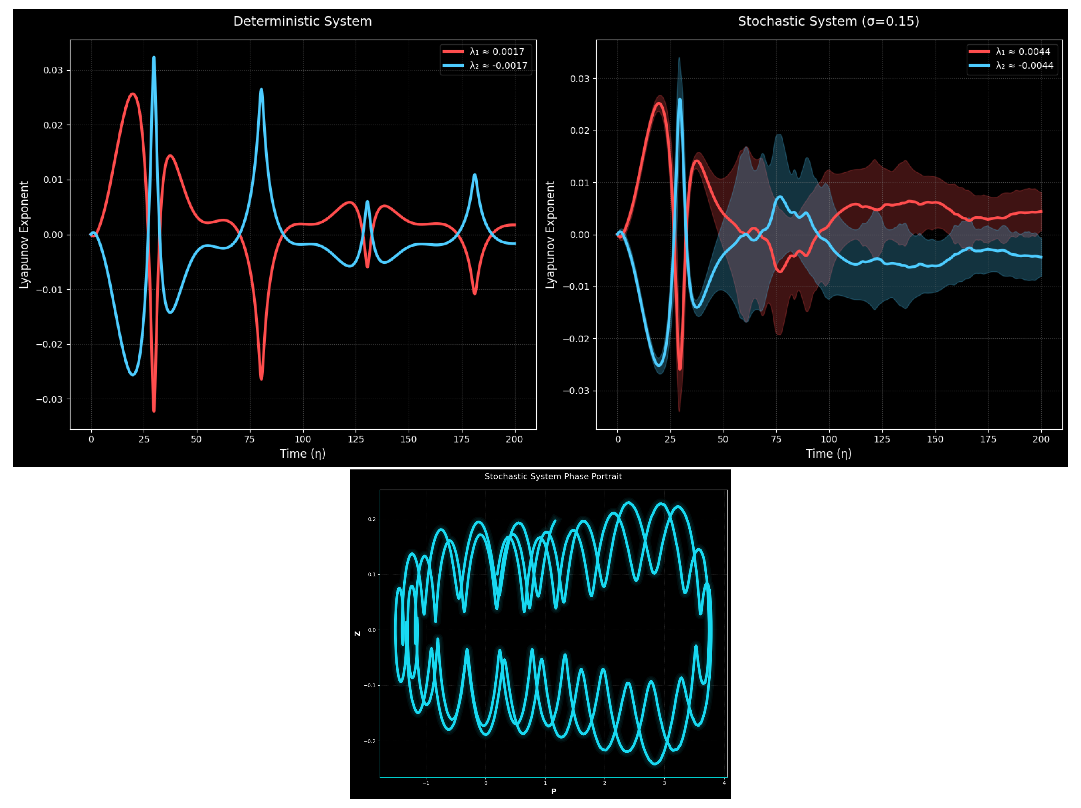), demonstrating noise-induced stabilization that suppresses chaotic divergence. This transition is visually confirmed in the phase portrait, where the stochastic system forms a bounded, noise-perturbed manifold in the