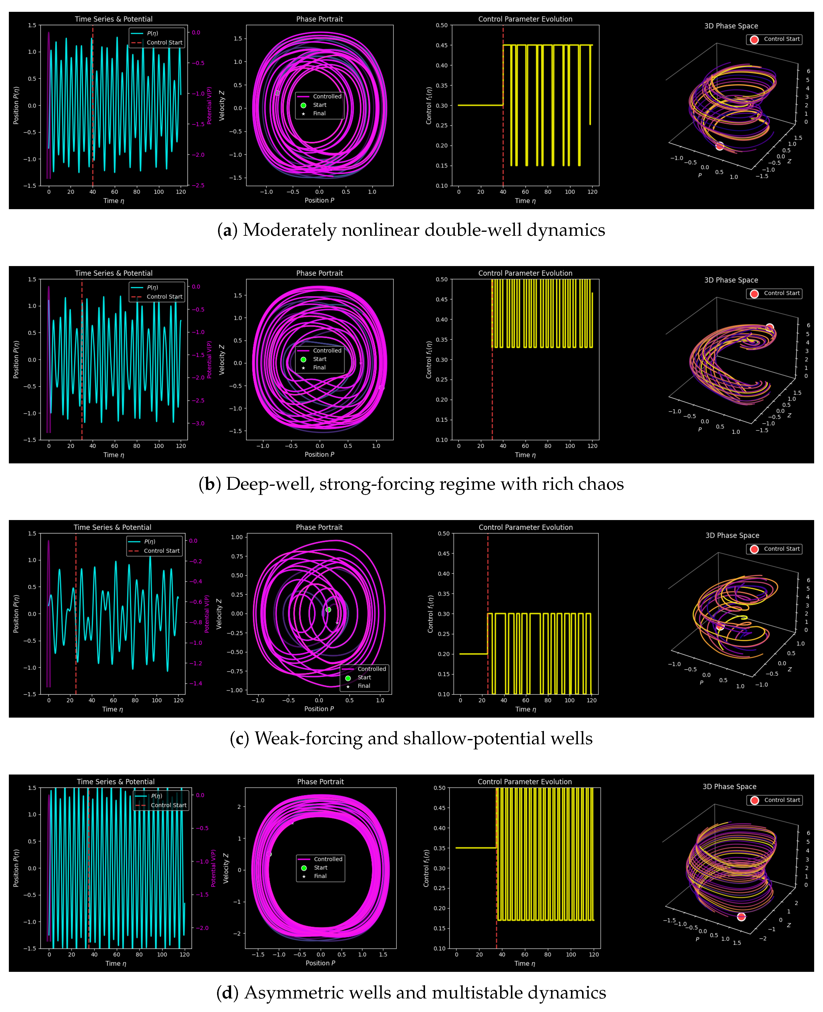 The qualitative and quantitative dynamic regime characterizations of periodic and quasi-periodic dynamical responses to chaos, intermittency, and coexistence between multiple attractors illustrated the sensitivity of nonlinear forced oscillators to changes in parameters. This study was able to capture the subtle transition mechanisms of these behaviors through intense visual and statistical diagnostics like Poincaré sections, recurrence plots, and Lyapunov spectra. Furthermore, the deterministic–stochastic comparisons showed that noise can reconfigure attractor geometry along with predictability horizons and can be either a stabilizing or destabilizing influence with regard to amplitude and system structure. As factors such as attractor structure and accessibility to UPOs are properly utilized, the OGY control demonstrations have shown that unstable periodic orbiting in extremely unpredictable double-well potentials can be selectively stabilized with few interventions. Finally, the stochastic bifurcation analysis with respect to the noise strength demonstrates that the underlying attractor structure of the nonlinear system remains robust under stochastic excitation, confirming that noise primarily induces bounded fluctuations rather than qualitative dynamical transitions within the investigated parameter regime.
