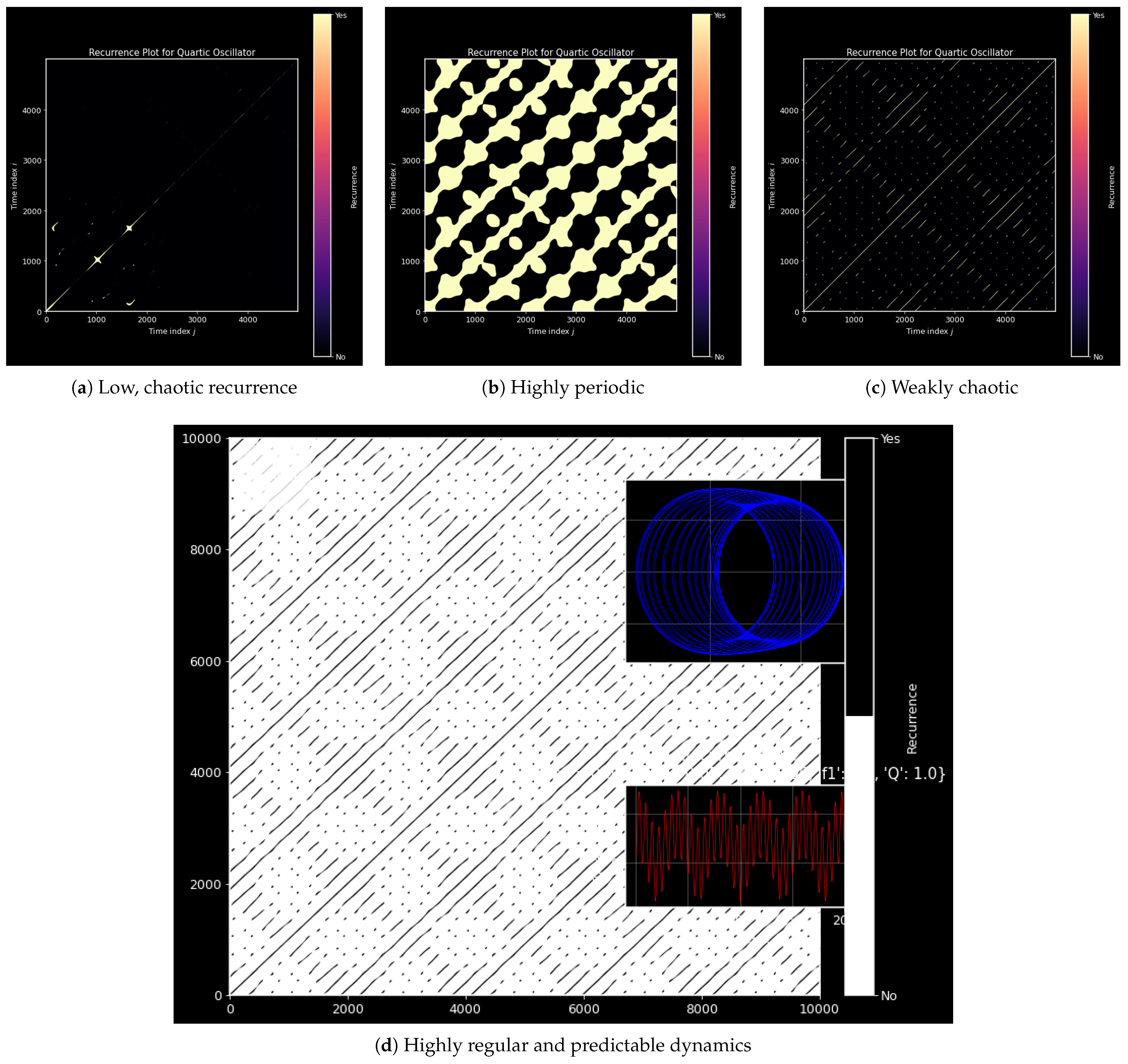 The findings illustrate obvious multistability in all of the parameter sets, whose dynamical complexity rises progressively between Set A and Set C. Bifurcation and a more sensitive basin of attraction are manifested by variations in attractors between smooth quasi-periodic and deformed—and then chaotic—structures of attractor through variations in the values of , , and . All things considered, the repeatedly forced quartic synthesizer shows tunable changes beyond periodic towards chaotic multistability, which are pertinent to systems like climate oscillators, biological rhythms, and MEMS resonators.
