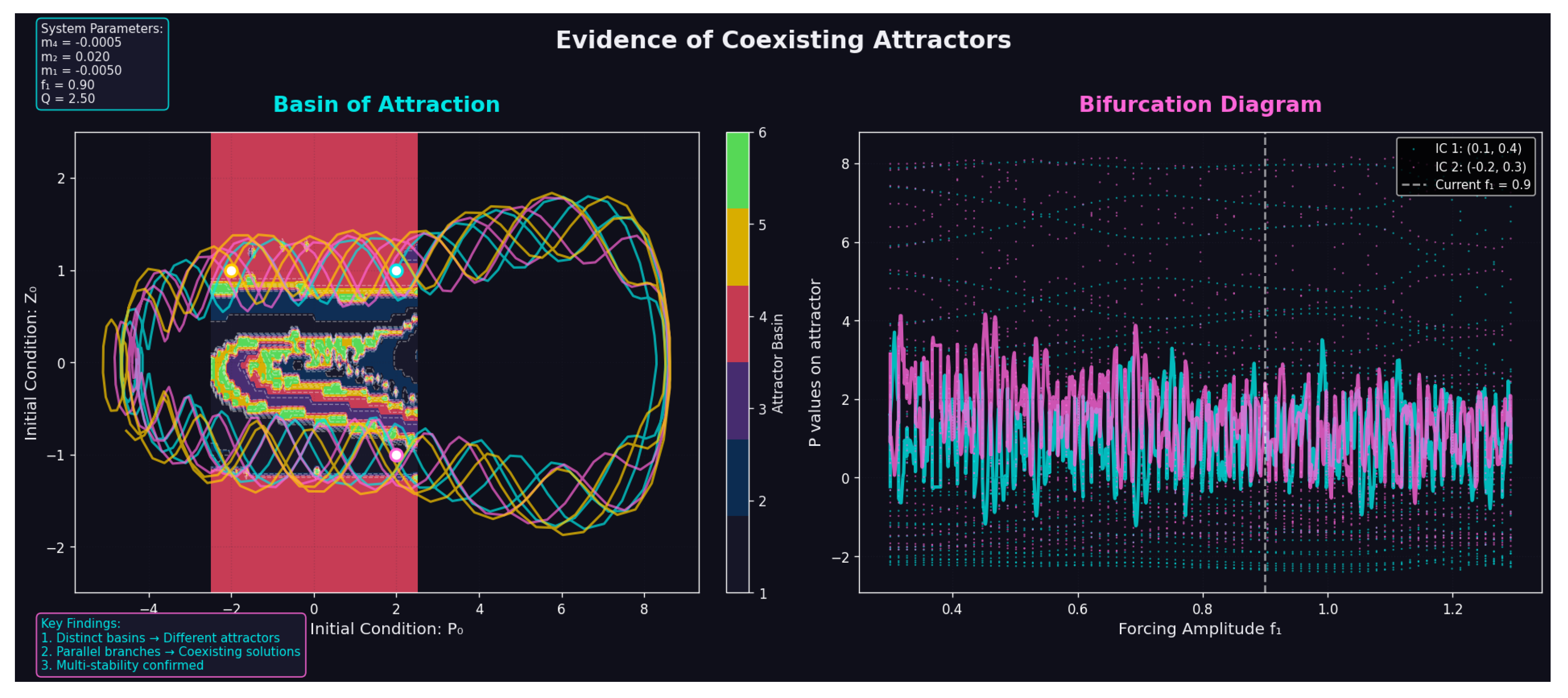 To rigorously substantiate the coexistence of attractors beyond qualitative phase-space visualization, complementary analyses were performed using basin-of-attraction computations and bifurcation diagrams for the same parameter set. The basin-of-attraction (left panel of