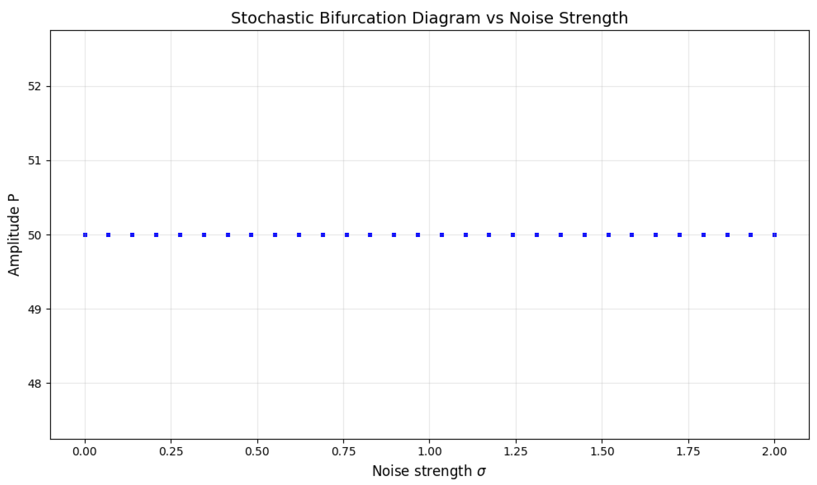 Notably, the absence of classical stochastic bifurcation signatures—such as noise-induced pitchfork splitting, intermittency, or attractor switching—demonstrates the structural stability of the oscillator with respect to variations in noise intensity. From a dynamical systems viewpoint, the topology of the phase space remains invariant under stochastic excitation, with noise only inducing bounded fluctuations around a persistent mean state. Such robustness is characteristic of strongly dissipative nonlinear systems operating away from critical thresholds.