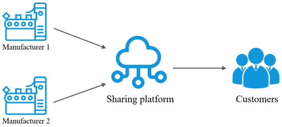 To help manufacturers and the sharing platform improve their profits and achieve mutual benefits, this paper focuses on the cooperation strategies between them. We consider three models under each cooperation strategy: the no-cooperation (Model N) model, the cost-sharing (Model CS) model, and the revenue-sharing (Model RS) model. In Model N, the sharing platform and manufacturers do not adopt any cooperation strategies. In Model CS, the sharing platform and manufacturers negotiate a cost-sharing ratio and jointly undertake the VAS cost. In Model RS, the sharing platform negotiates a revenue-sharing rate with manufacturers, who then share their revenue with the platform. Subsequently, we establish a shared supply chain structure including a sharing platform, two manufacturers, and customers, which is also used in [24]. Customers submit manufacturing requirements and specifications to the sharing platform. The sharing platform then finds manufacturers capable of producing products according to customers’ requirements and specifications. The shared supply chain structure and the relation between its members are illustrated in Figure 1.