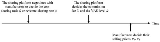 Manufacturer 1 and Manufacturer 2 are supposed to provide two types of substitutable products (denoted as ). They decide their products’ selling prices and . Manufacturers need pay commission fee to the sharing platform based on the number of products sold so that manufacturers can use the services provided by the sharing platform [50]. The commission fee is decided by the sharing platform. To facilitate cooperation and encourage users to participate, more and more sharing platforms provide VAS [36] such as search, match, payment security, quality inspection, and so on. We assume that the sharing platform provides VAS for manufacturers and customers. The VAS level decided by the sharing platform is . The VAS cost is , where represents the VAS cost coefficient [16]. Note that our baseline assumes a common VAS level that improves the platform’s overall transaction environment (matching, verification, quality assurance) and therefore benefits the market as a whole; this is consistent with many platform settings where service investments are largely non-excludable across sellers. The cost allocation structure is simplified to isolate the core incentive-alignment mechanism of cost sharing versus revenue sharing. We model the leader–follower relationship between the sharing platform and two manufacturers as a Stackelberg game, where the sharing platform is the leader and manufacturers are the followers. The decision sequence is shown in Figure 2.