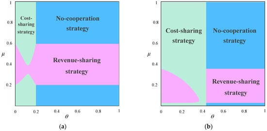 To ensure that the dominant conclusions are not driven by specific parameter choices, we perform extensive sensitivity analyses by jointly varying key parameters and report dominance maps and threshold shifts. In addition, we impose standard regularity conditions to ensure a well-behaved demand system and interior equilibria (positive demand and concavity of objective functions). Accordingly, (or an economically meaningful interval), , , and the admissible range of follows from the requirement that equilibrium quantities and profits remain nonnegative. Referring to the previous literature [7,24,49], we set ,,,,. Through the graphs, manufacturers and the sharing platform can clearly know what their respective optimal cooperation strategies are when the cost-sharing ratio and the revenue-sharing rate take different values. If their optimal strategies align, both sides will enter cooperation. If their optimal strategies differ, both sides will negotiate to decide whether to cooperate and which strategy to adopt. This leads to Corollary 2.