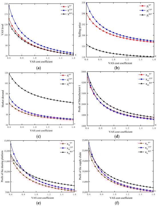Under the above three models, the equilibrium results of commission fee, VAS level, selling price, market demand and the sharing platform’s profit are negatively related to the VAS cost coefficient. Additionally, in Model N, the equilibrium profits of manufacturers and the supply chain are also negatively related to the VAS cost coefficient. Proposition 1 suggests that as the VAS cost coefficient increases, the sharing platform will reduce the VAS level to lower the VAS cost. Since it is not possible to provide as high VAS level as it used to, the commission fee set by the sharing platform will also decrease, which is consistent with [24] in that the commission fee is positively related to the VAS level. In addition, a lower VAS level also weakens the service support provided by the platform, deteriorating both manufacturers’ selling efficiency and customers’ purchasing experience. This reduction in service quality suppresses market demand. In response, manufacturers cut selling prices to partially offset the demand loss.