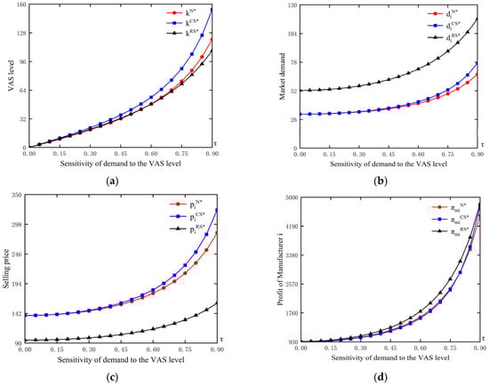 Under Model N and Model CS, the equilibrium results of commission fee, VAS level, market demand, and the sharing platform’s profit are negatively related to manufacturer’s unit production cost. In addition, in Model N, the equilibrium profits of manufacturers and the supply chain are also negatively related to manufacturer’s unit production cost. In contrast, in Model RS, the equilibrium results of VAS level and selling price are positively related to manufacturer’s unit production cost. Proposition 4 indicates that as the production cost increases, the sharing platform in Model N and Model CS reduces the commission fee to prevent excessive increases in manufacturers’ selling prices. This is because without a reduction in the commission fee, manufacturers would raise prices to secure sufficient profits. Consequently, market demand will decrease, reducing the platform’s profitability. Therefore, the platform reduces commission fees to prevent manufacturers from raising prices, thereby maintaining market demand and ensuring its profitability. In addition, the VAS level will decrease due to the lower commission fee. It is worth noting that in Model RS, where no commission fee is charged, manufacturers will raise prices as production cost increases. With a fixed revenue-sharing rate, the platform’s revenue rises as selling prices increase. To stimulate market demand, the sharing platform will be willing to provide higher VAS level.