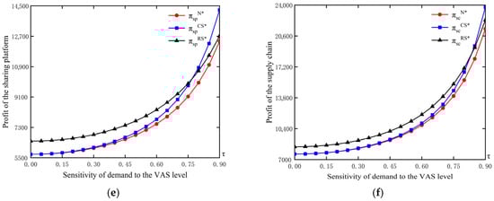 Across the three models, the equilibrium commission fee, VAS level, selling price, market demand, and the platform’s profit all increase with the sensitivity of demand to the VAS level. Moreover, under Model N, manufacturers’ profit and total supply-chain profit are also increasing in this sensitivity. As stated in Proposition 2, a higher demand sensitivity implies that customers place greater value on the platform’s VAS. By improving the purchasing experience, VAS becomes more effective at stimulating purchases, which expands market demand. Anticipating stronger demand, manufacturers optimally raise selling prices, and the platform increases the commission fee to capture part of the enlarged surplus. Meanwhile, higher demand typically comes with stronger service requirements, prompting the platform to invest more in VAS, which results in a higher equilibrium VAS level.