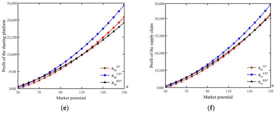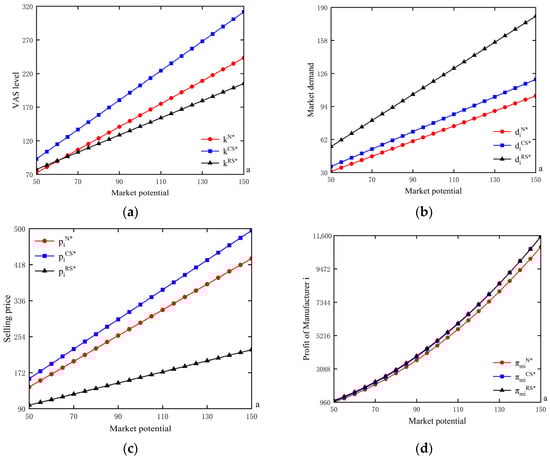 Across the three models, the equilibrium commission fee, VAS level, selling price, market demand, and the platform’s profit are all increasing in market potential. Moreover, under Model N, manufacturers’ profit and total supply-chain profit also rise with market potential. As stated in Proposition 3, a larger market potential expands customers’ willingness to purchase, thereby increasing market demand. Facing a larger demand base, manufacturers optimally raise selling prices, and the platform increases the commission fee to capture a greater share of the expanded surplus. At the same time, stronger market potential typically translates into higher service requirements and transaction volume, which induces the platform to invest more in VAS, leading to a higher equilibrium VAS level.