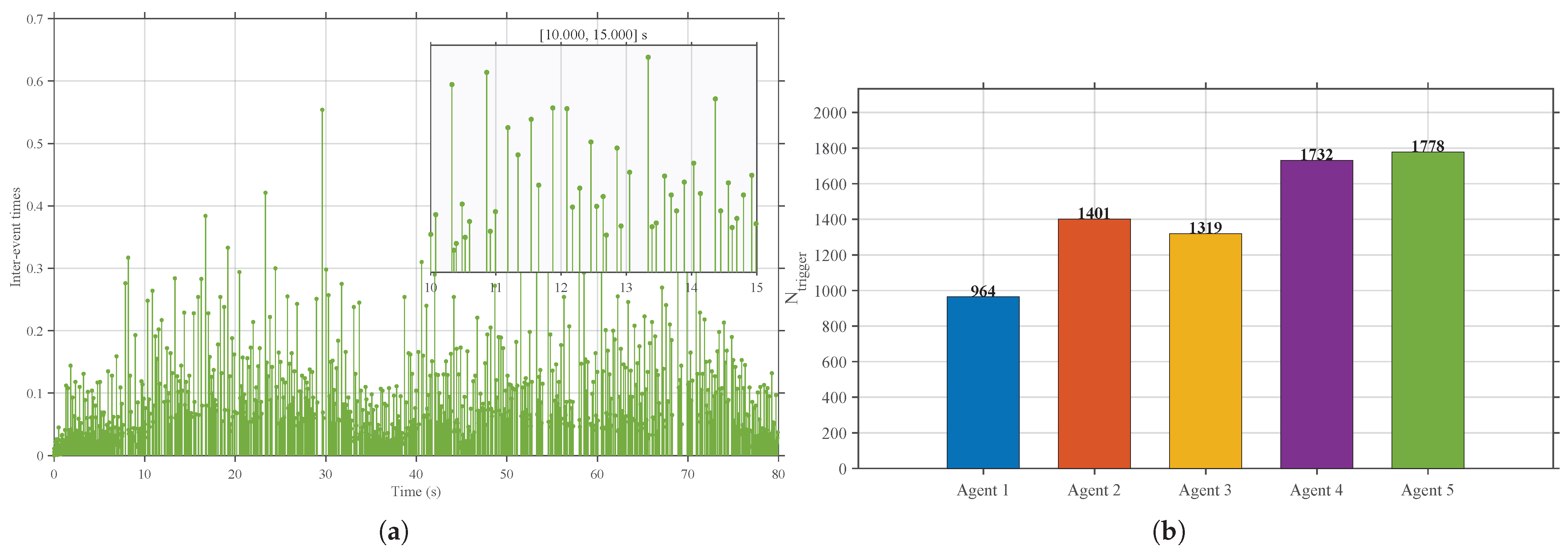 - Choi, Y.H.; Yoo, S.J. Neural-Network-Based Distributed Asynchronous Event-Triggered Consensus Tracking of a Class of Uncertain Nonlinear Multi-Agent Systems. IEEE Trans. Neural Netw. Learn. Syst. 2022, 33, 2965–2979. [Google Scholar] [CrossRef]