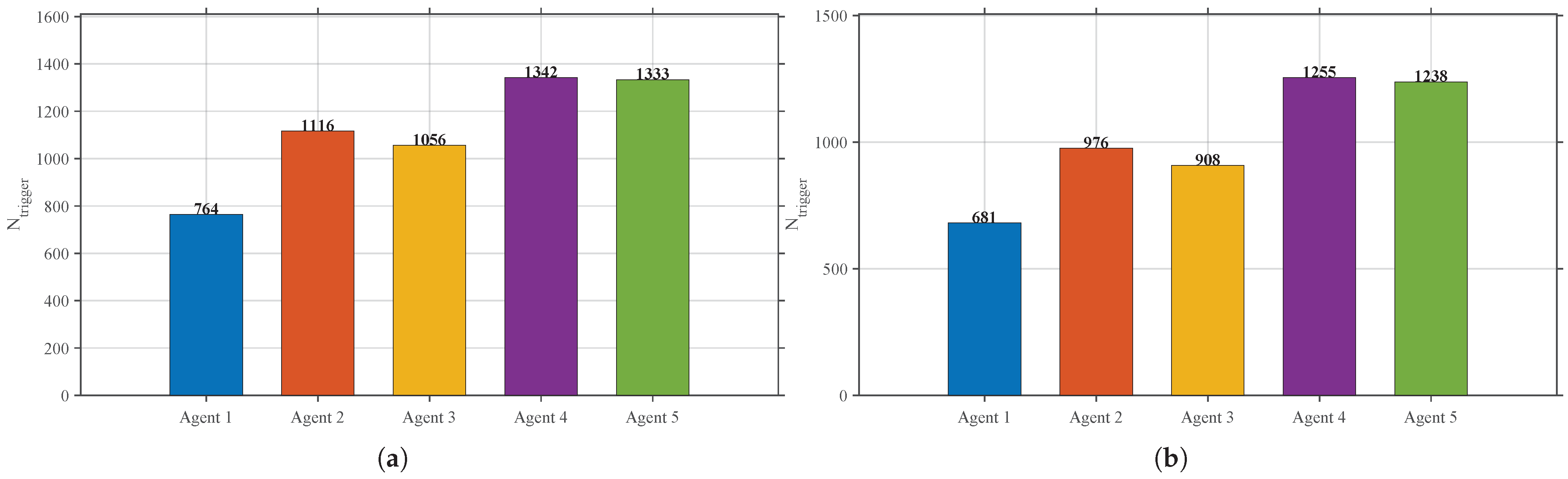- Peng, Z.; Luo, R.; Hu, J.; Shi, K.; Ghosh, B.K. Distributed Optimal Tracking Control of Discrete-Time Multiagent Systems via Event-Triggered Reinforcement Learning. IEEE Trans. Circuits Syst. I 2022, 69, 3689–3700. [Google Scholar] [CrossRef]