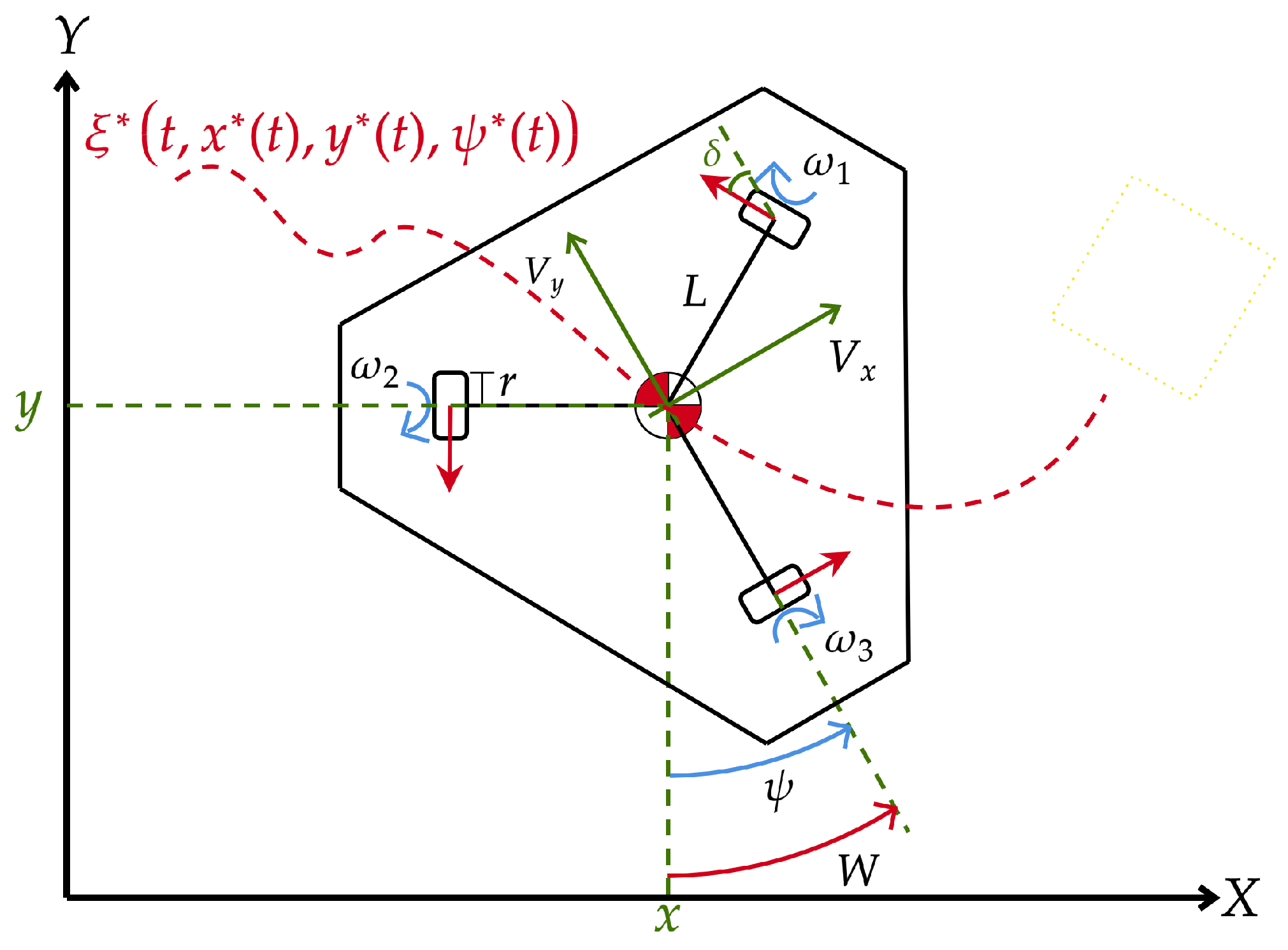 Figure 1 shows a top view of the omnidirectional robot configuration. The fixed frame