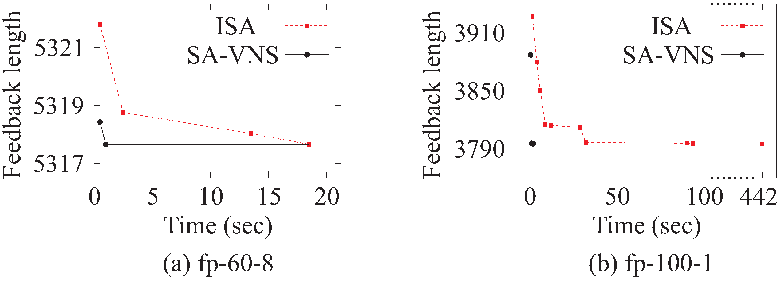 fp-100-1. We see that SA-VNS identifies the best solution particularly quickly, whereas ISA needs a much longer time to do so. For instances with