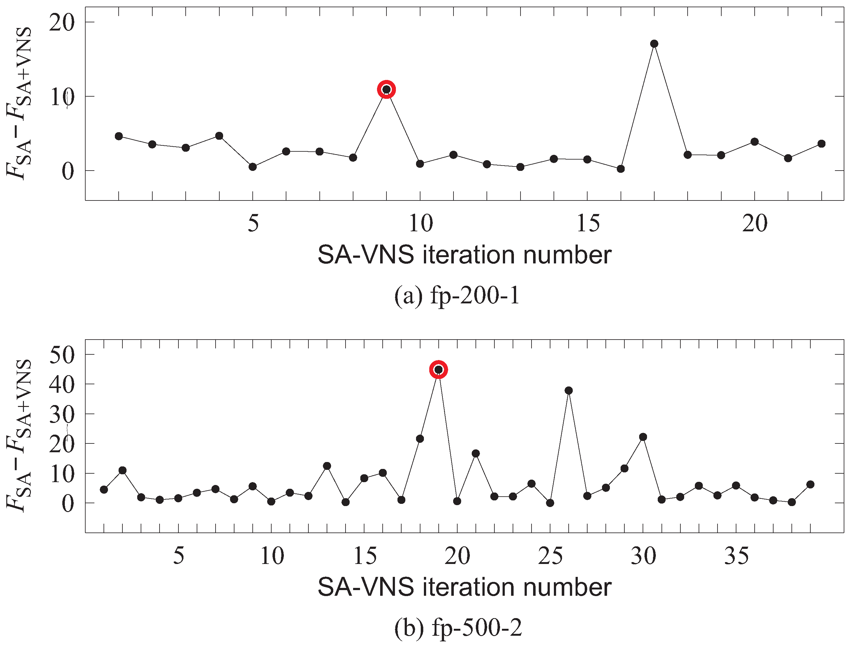 fp-500-2, from our testbed. In each iteration of SA-VNS, the SA algorithm was first applied. Let us assume that the objective function value achieved by SA is denoted by