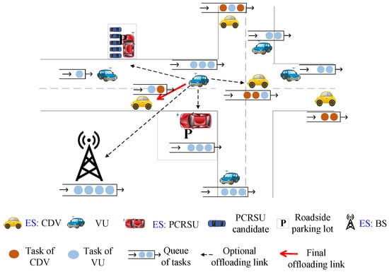 With the fast development of 5G technology [1,2] and IoV [3], the vehicle has become a smart device with communication, computing, and storage capabilities. However, the limited on-board storage and computing resources often cause large latency for local task processing and result in degradation of system QoS as well as user QoE, which can hardly satisfy the latency-sensitive and computation-intensive demands of VUs for real-time application like online entertainment. To this end, VUs may offload tasks for MCC or MEC that provide service and cloud computing capabilities at the edge of the mobile network to relieve their own computational burden [4]. However, the edge server such as the BS needs to serve a huge number of mobile users simultaneously and cannot always provide timely response to VUs. Using RSUs to replace BSs is a feasible solution, but the implementation of massive arrangement of RSUs is costly. For example, installing RSU in only one US city costs about USD 18.63 billion, and the annual maintenance cost is approximately USD 1.1 billion [5,6]. Papers [7,8] propose to use PCRSUs, making it an alternative to RSUs. Moreover, driving vehicles around the VU with a similar trajectory may share idle computing and storage resources, forming the VCEC [9,10]. As a result, MTVC via BS, PCRSU, CDV, and VU local computing is emerging as a new paradigm for latency-sensitive and computation-intensive task processing in IoV. Notably, CDVs can provide idle computing resources by sharing redundant capabilities of vehicles with similar trajectories, while ESs ensure reliable queue length broadcasting through periodic feedback and channel verification to support accurate offloading decisions.
