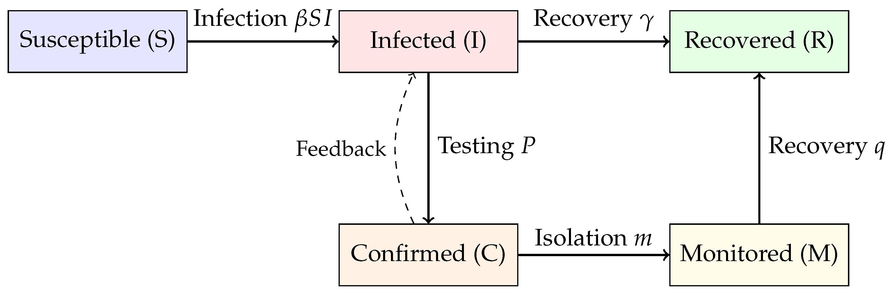 The interjection by testing has consequences: first, test-positive patients are most likely to go into some forms of isolation, which can be described as a class of isolated/monitored individuals and denoted by a new compartment M, therefore changing the transmission dynamics between susceptible and infected; second, our knowledge of confirmed cases almost certainly moderates our behaviors to mitigate the transmission, thus further changing the outbreak dynamics. That is, our measures to monitor and mitigate the pandemic through testing change the dynamics we would like to know. Most of the current mathematical models have not considered the testing compartment for COVID-19 transmission or its dynamic behaviors. More precisely, for mathematical models to have real-world fidelity, they must account for the observation process. As pointed out before, in a managed pandemic, the “Infected” class (I) is unobservable; policy and resource allocation are driven by the “Confirmed” class (C). This creates a feedback loop: rising confirmed cases trigger alarm, leading to the mobilization of testing resources (pop-up sites, rapid tests), which in turn increases confirmation rates. This reflexive dynamic, constrained by physical capacity limits, acts as a nonlinear delay oscillator.