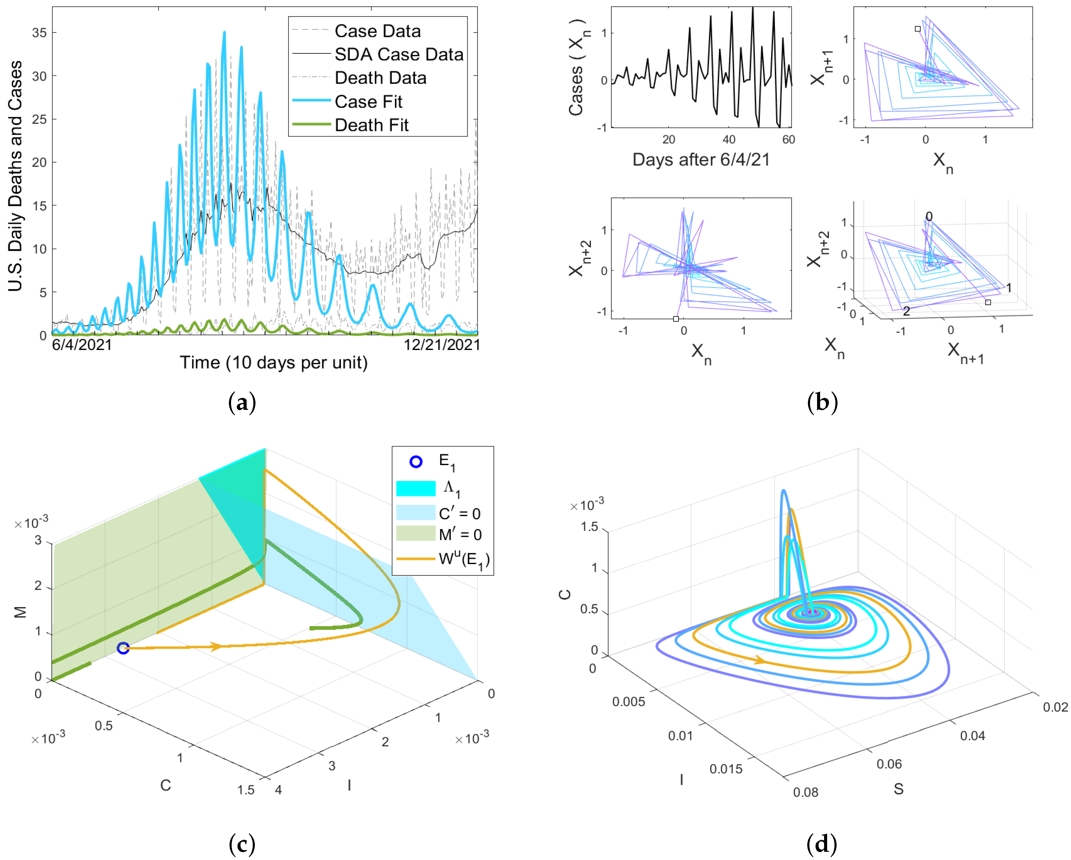 Finally, our synthesis underscores that simple SIR-type models miss key complexity. By including the testing compartments and Holling II saturation, the SICMR predicts instabilities that standard models cannot (the tested-endemic becomes a saddle-focus). However, we note limitations: we did not prove the existence of an actual chaotic attractor (no true homoclinic orbit was found), so the autonomous model may remain periodic without noise. Moreover, our deterministic fit does not fully reproduce the empirical attractor complexity.