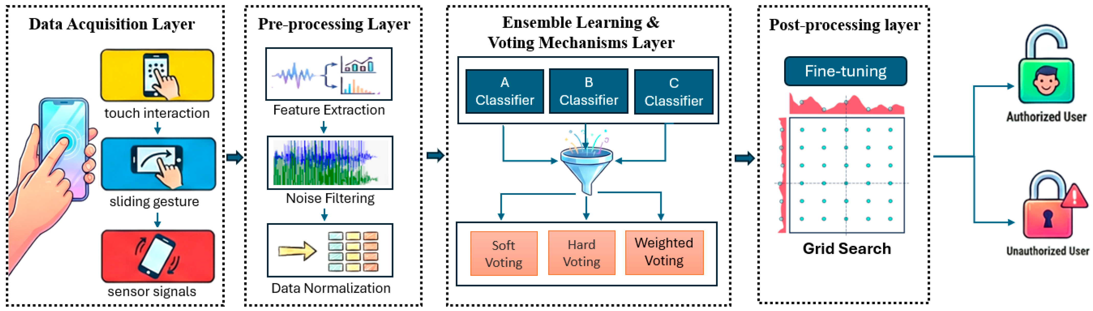 Table 3. Data collection was performed using the OPPO A3 Pro smartphone equipped with a MediaTek Dimensity 7050 processor running Android 14. This device served as the edge computing node for capturing high-fidelity telemetry. The study involved 15 participants (10 males, 5 females) to ensure gender diversity in behavioral patterns. The data collection pipeline consisted of three synchronized phases: touch (keystroke dynamics), sliding (geometric trajectory analysis), and sensor signals (IMU sensor fusion). Each data collection session comprised three distinct phases: (1) a numeric keypad interaction requiring discrete taps on specific digits, (2) a trajectory tracing task where users were prompted to follow a geometric template, and (3) a device kinematic task involving physical orientation shifts (tilting the device left or right). This comprehensive sequence was performed over four consecutive rounds, with the first and second rounds utilizing a circular template, while the third and fourth rounds employed a square template to capture variations in motor control across different geometric constraints.