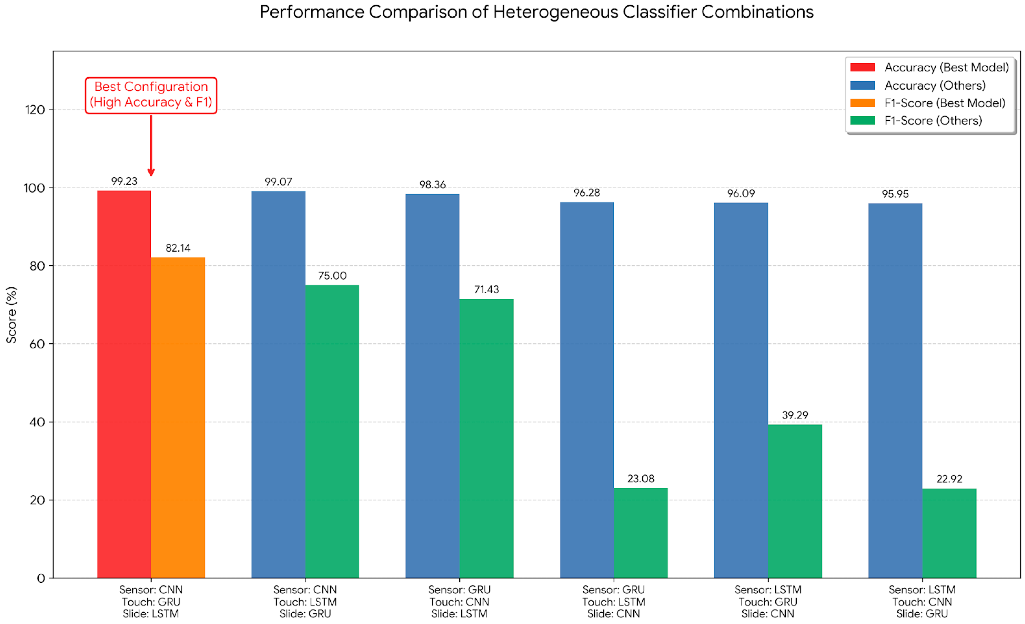 Figure 3. The configuration employing CNNs for sensor data, GRUs for touch input, and LSTMs for sliding achieves the highest accuracy and F1-score, confirming the necessity of modality-specific architectural alignment. This architecture attains a peak accuracy of 99.23% and an F1-score of 82.14%. This performance hierarchy can be attributed to the intrinsic properties of each neural architecture. CNNs demonstrate superior capability in modeling high-frequency inertial signals, providing a stable baseline. GRUs are computationally efficient and effectively capture the short-term, sparse characteristics of touch tap events. LSTMs excel at modeling longer-term temporal dependencies inherent in continuous sliding. In contrast, architectures that misalign models with modalities (e.g., using LSTMs for sensor data, CNNs for touch, and GRUs for sliding) suffer significant performance degradation, with F1-scores dropping to as low as 22.92%. These results confirm that a specialized model approach is insufficient for multimodal behavioral biometrics.