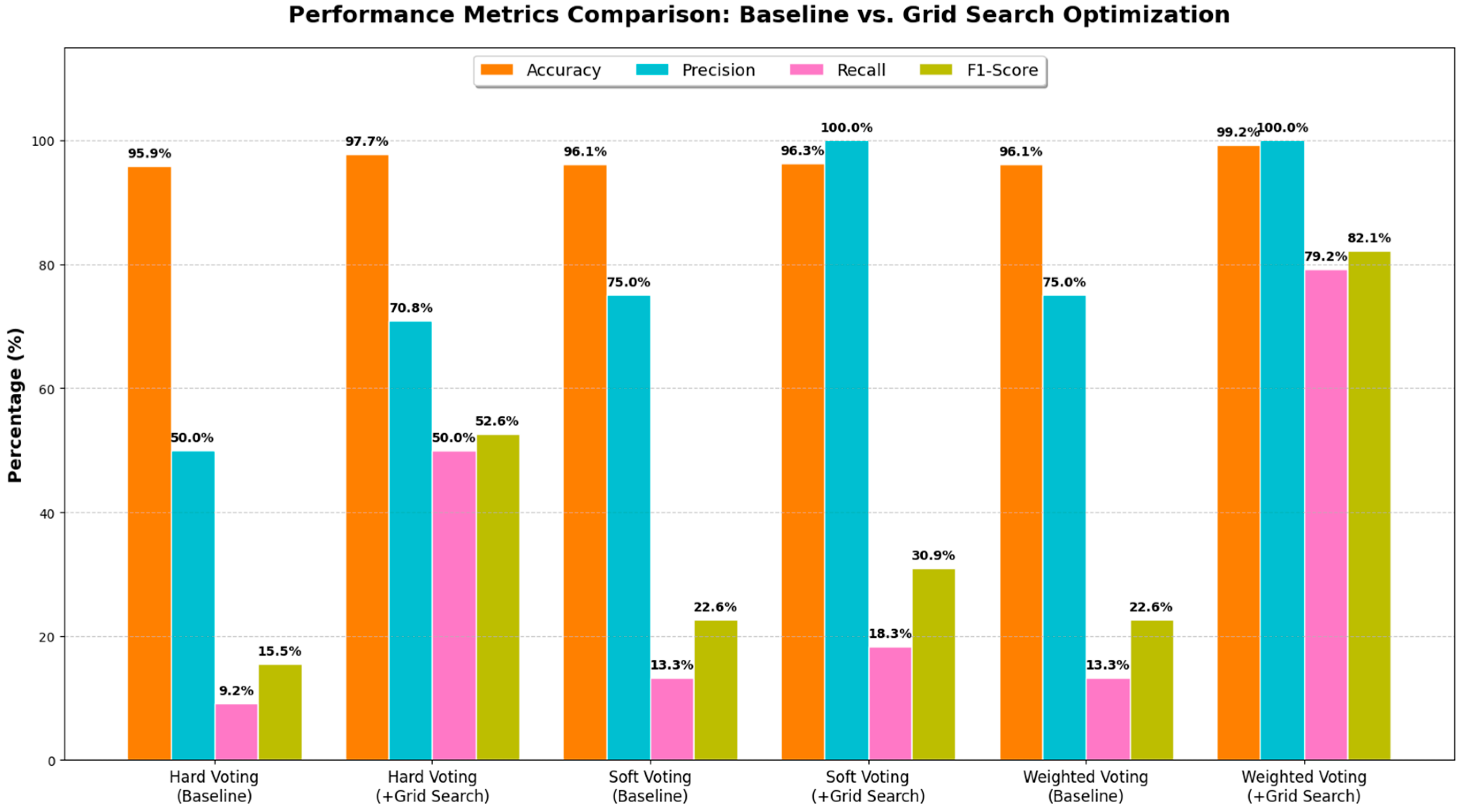 Table 4, while the baseline hard voting achieved an accuracy of 95.87%, its F1-score was limited to 15.48% due to a critical recall of only 9.17%. Similarly, soft voting and weighted voting produced identical baseline results with an F1-score of 22.62%, indicating that without calibration, the ensemble classifiers failed to effectively distinguish the minority class from the noise of the majority class.