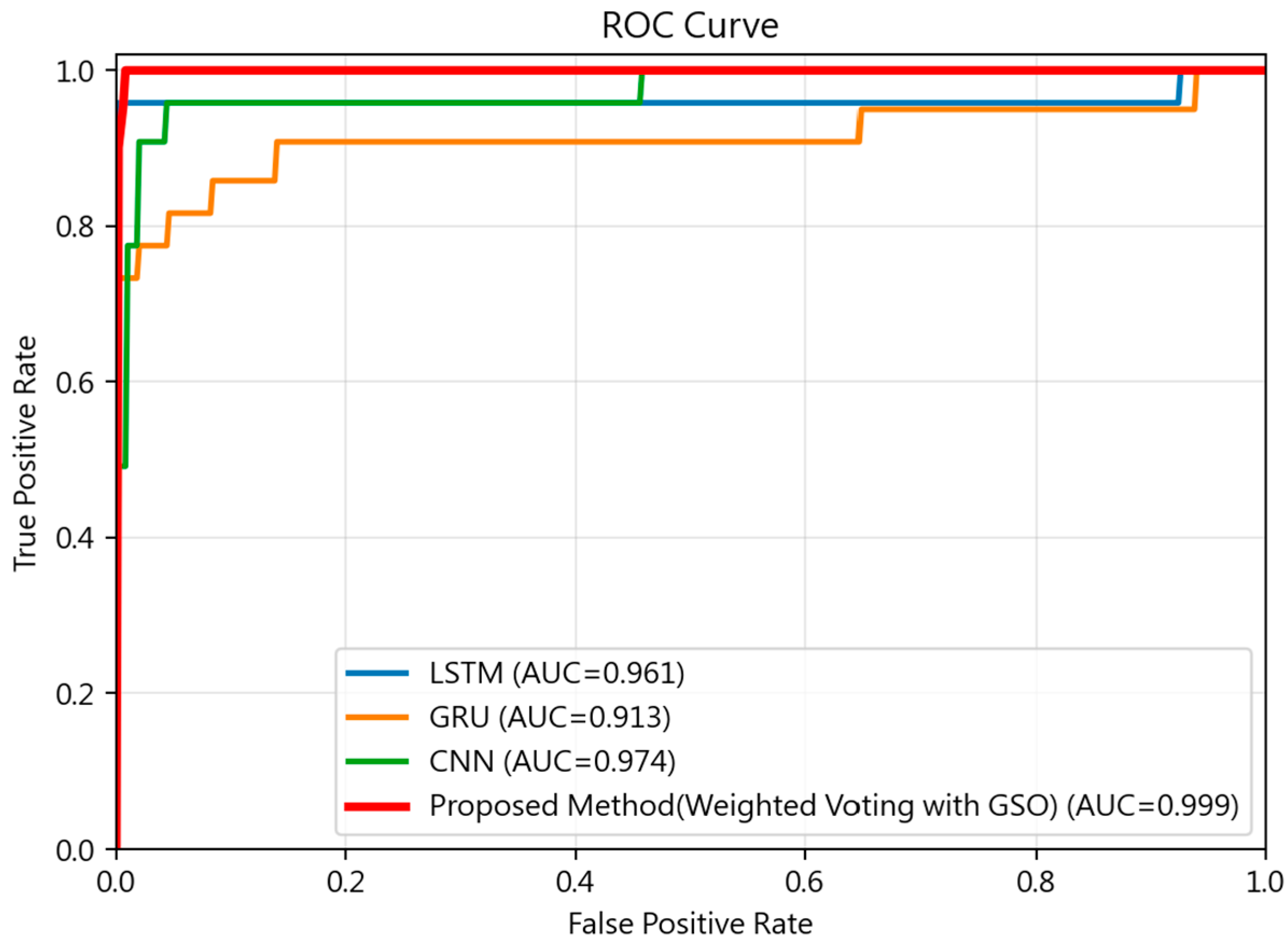 Figure 5, the proposed method achieves a near-ideal Area Under the Curve (AUC) of 0.999, which significantly exceeds the performance of the standalone CNN (AUC = 0.974), LSTM (AUC = 0.961), and GRU (AUC = 0.913) architectures. This superior discriminative power demonstrates that the GSO strategy effectively aligns the multimodal feature spaces to establish a precise decision boundary. Specifically, the proposed ensemble maintains a high TPR even at extremely low FPR levels—a critical requirement for maintaining a rigorous security posture within ZTA environments without compromising user experience.