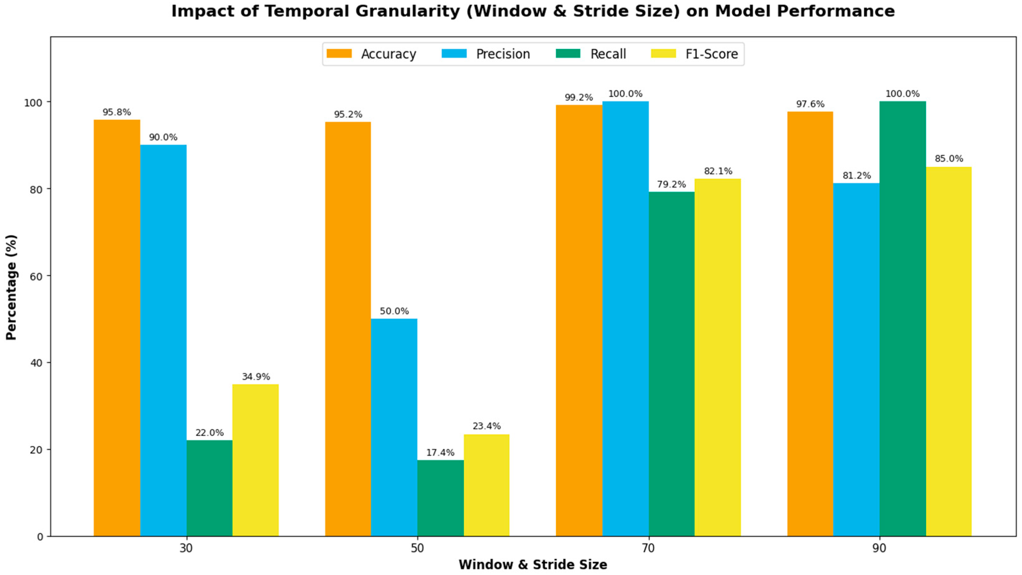 Figure 6, an optimal balance between security and stability was identified at a window and stride size of 70. At this setting, the system achieved the highest accuracy (99.23%) and perfect precision (100.00%), resulting in a robust F1-score of 82.14%. At smaller granularities (W, S = 30 or 50), the models exhibited significantly lower recall (21.96% and 17.37%, respectively) and F1-scores (34.86% and 23.43%). The data suggests that lower temporal granularities fail to capture sufficient latent behavioral context, resulting in elevated false rejection rates. Conversely, increasing the granularity to 90 achieved perfect recall (100.00%) but at the cost of reduced precision (81.25%) and accuracy (97.60%). The decline in precision indicates that excessively large windows may incorporate redundant or noisy data points that degrade the distinctiveness of the user’s behavioral patterns. Consequently, size 70 was established as the optimal operating point for the proposed framework.