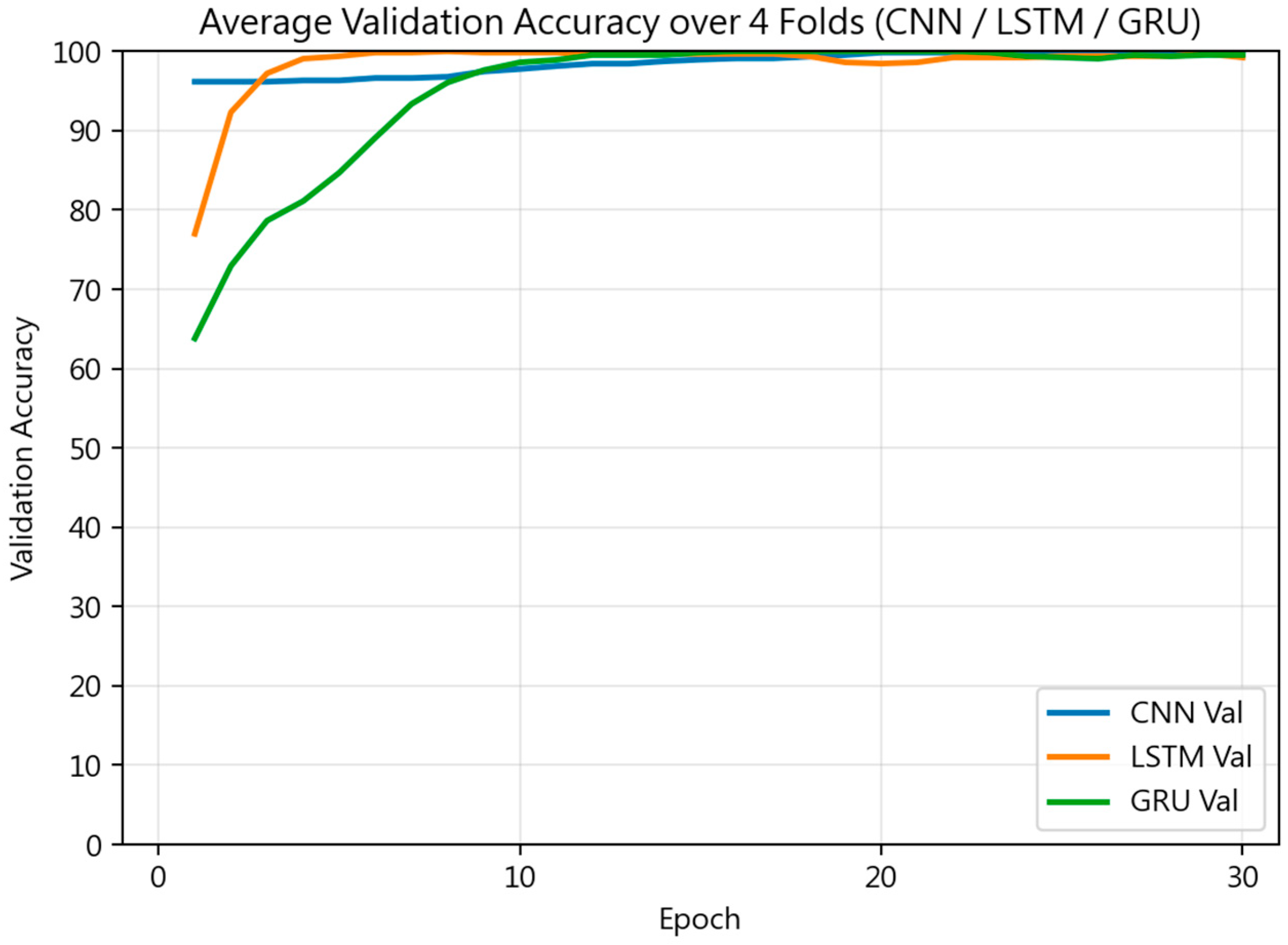 Table 5 provides a comprehensive performance benchmark, contrasting the singular modalities, CNNs, GRUs, and LSTM against the proposed method that integrates these heterogeneous topologies via a Grid Search-optimized weighted voting scheme. The data indicates that the standalone CNNs exhibit a respectable accuracy of 92.85% by effectively capturing spatial patterns in high-frequency sensor, yet it remains hindered by a relatively low precision of 55.26%, suggesting a propensity for false positives in complex usage scenarios. Similarly, although the GRUs architecture achieves a baseline accuracy of 97.29%, its recall remains capped at 58.33%, demonstrating an inability to resolve the subtle temporal dependencies required for robust identity verification across diverse interaction types.