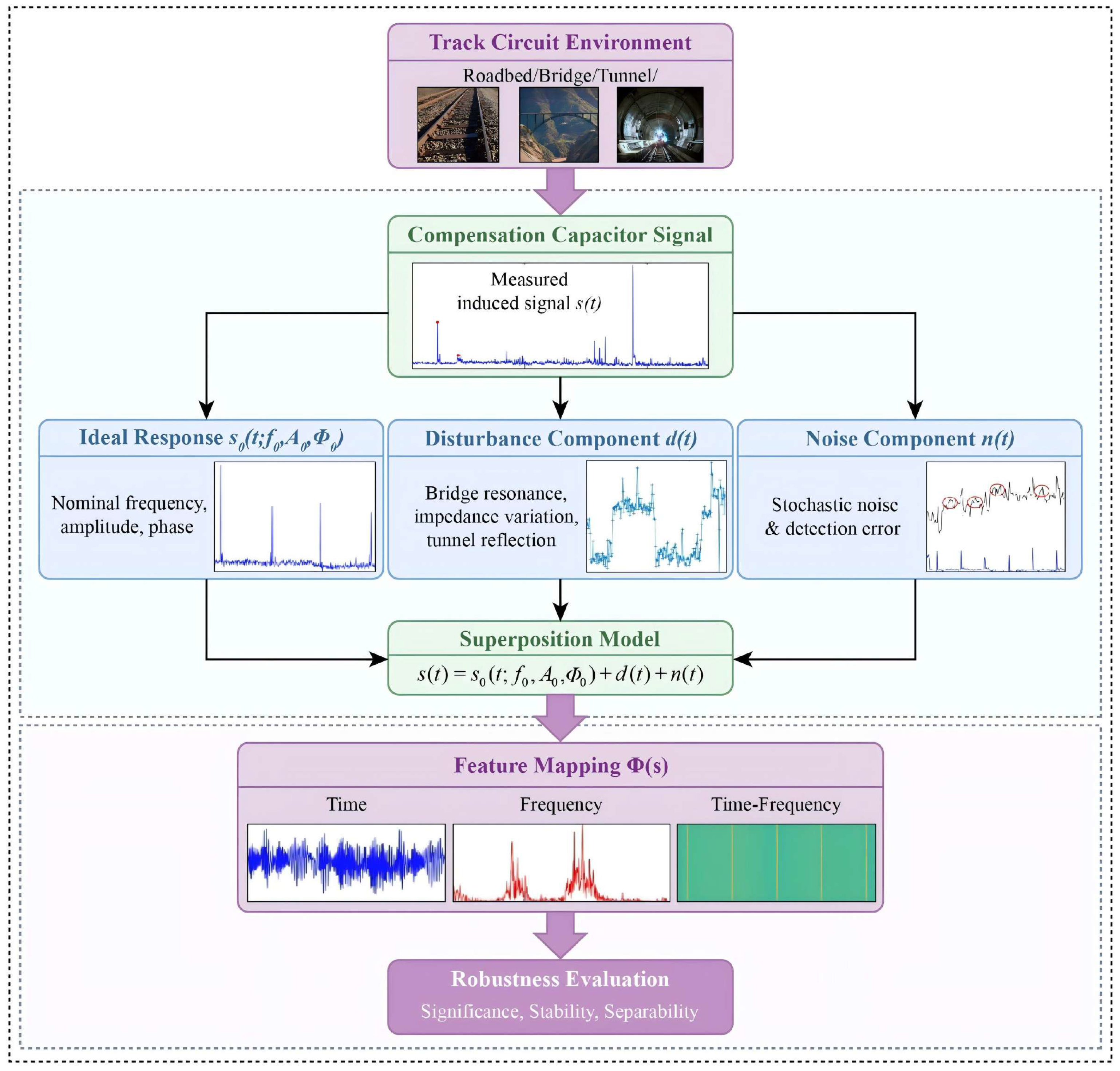 Despite these advancements, most existing studies primarily emphasize model architecture optimization and classification accuracy, while treating signal features as static inputs, with limited consideration of their stability and robustness under environmental disturbances. In real-world railway environments, compensation capacitor signals (CCS) are subject to multiple overlapping disturbances, including bridge structural resonance, ballast impedance fluctuations, and tunnel electromagnetic reflections [