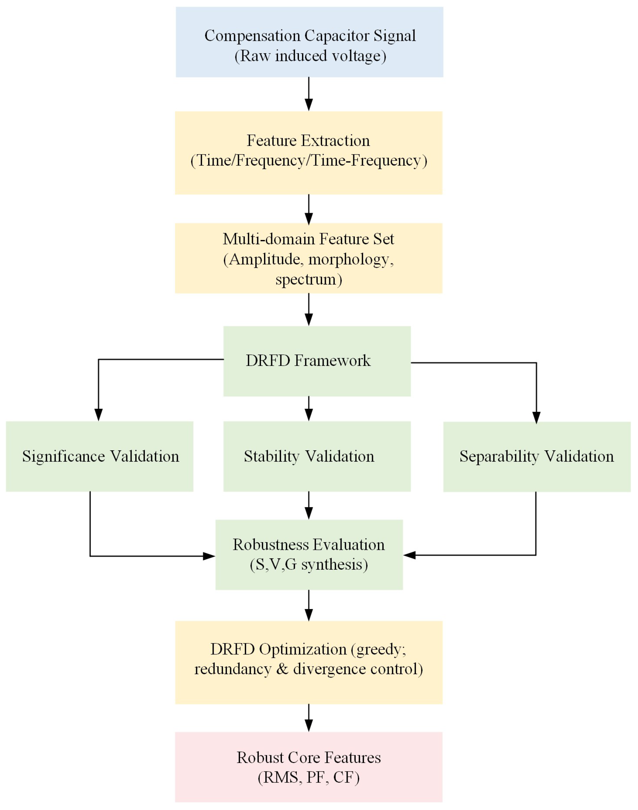 To visualize the complete workflow, the DRFD system starts with the acquisition of raw compensation-capacitor signals, followed by multi-domain feature extraction in the time, frequency, and time–frequency domains. The extracted features are subsequently evaluated through the Three-Perspective Robustness Validation (CCS-TRV) process, which assesses each feature’s statistical significance, environmental stability, and geometric separability.