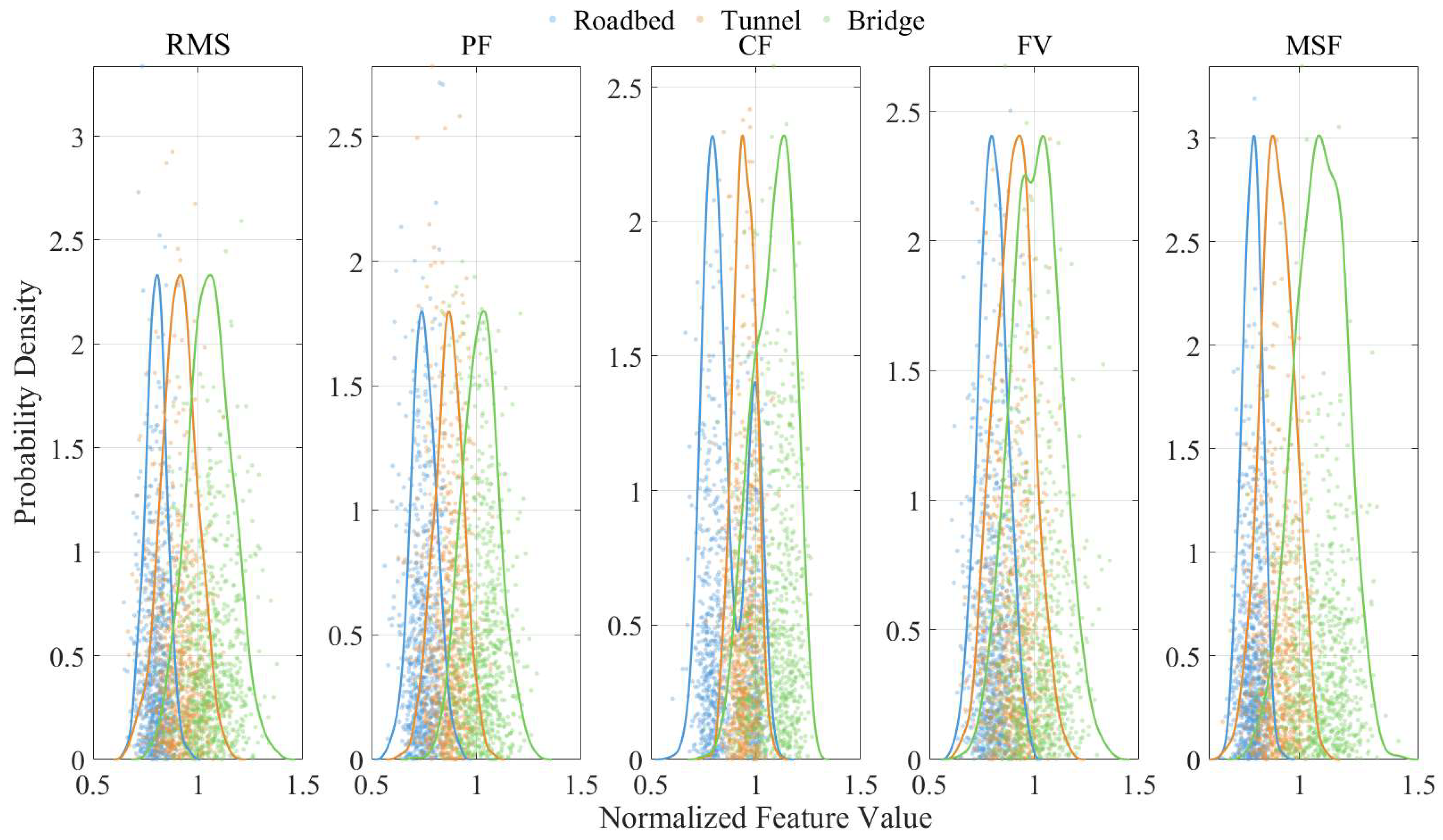 The observed spectral behaviors substantiate the physical relevance of the three core features extracted by the DRFD framework. Specifically, the RMS reflects the overall energy concentration of the induced-voltage signal and tends to decrease under attenuation and multipath interference, as commonly observed in tunnel environments. The PF characterizes transient spikes arising from dynamic structural vibration and coupling resonance, which are most pronounced under bridge conditions. In contrast, the CF describes the migration of the spectral center, exhibiting upward shifts under resonance-induced harmonic enrichment and downward shifts in attenuated electromagnetic fields.