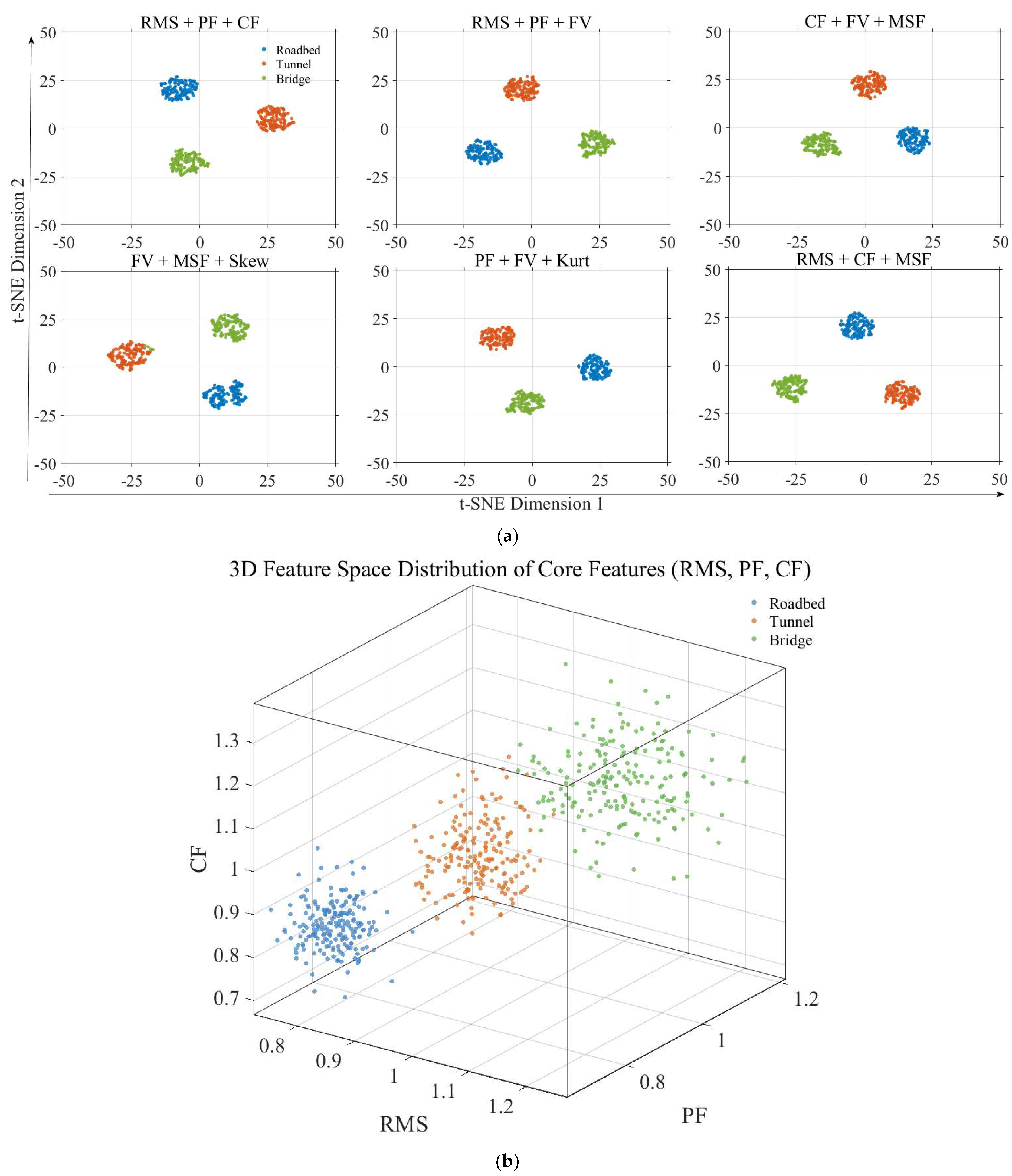 Experimental results demonstrate that the selected features maintain strong discriminability across roadbed, tunnel, and bridge environments, while corresponding to meaningful electromagnetic behaviors such as spectral diffusion, vibration coupling, and harmonic resonance. These findings align with those of Song et al. [