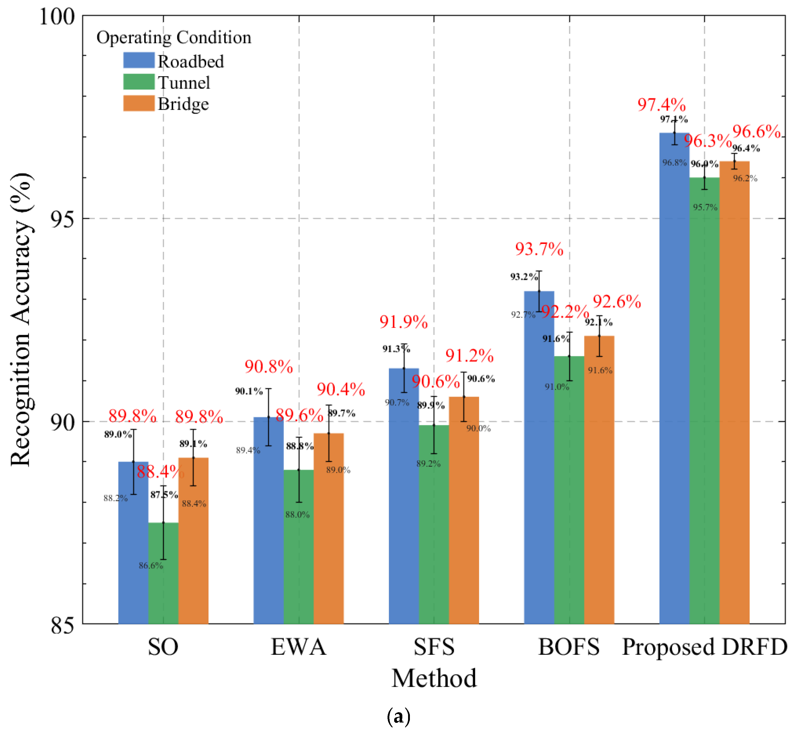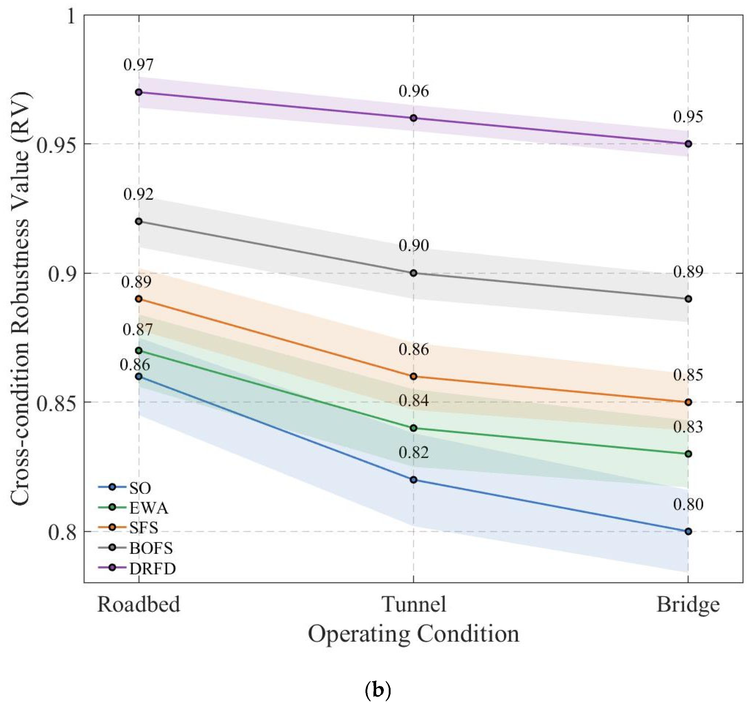 Figure 8a shows the recognition accuracy of all evaluated methods under different operating conditions (roadbed, tunnel, and bridge). As shown, DRFD consistently achieves the highest and most stable performance, significantly outperforming all baseline methods. This demonstrates DRFD’s ability to maintain high performance across diverse environmental conditions.