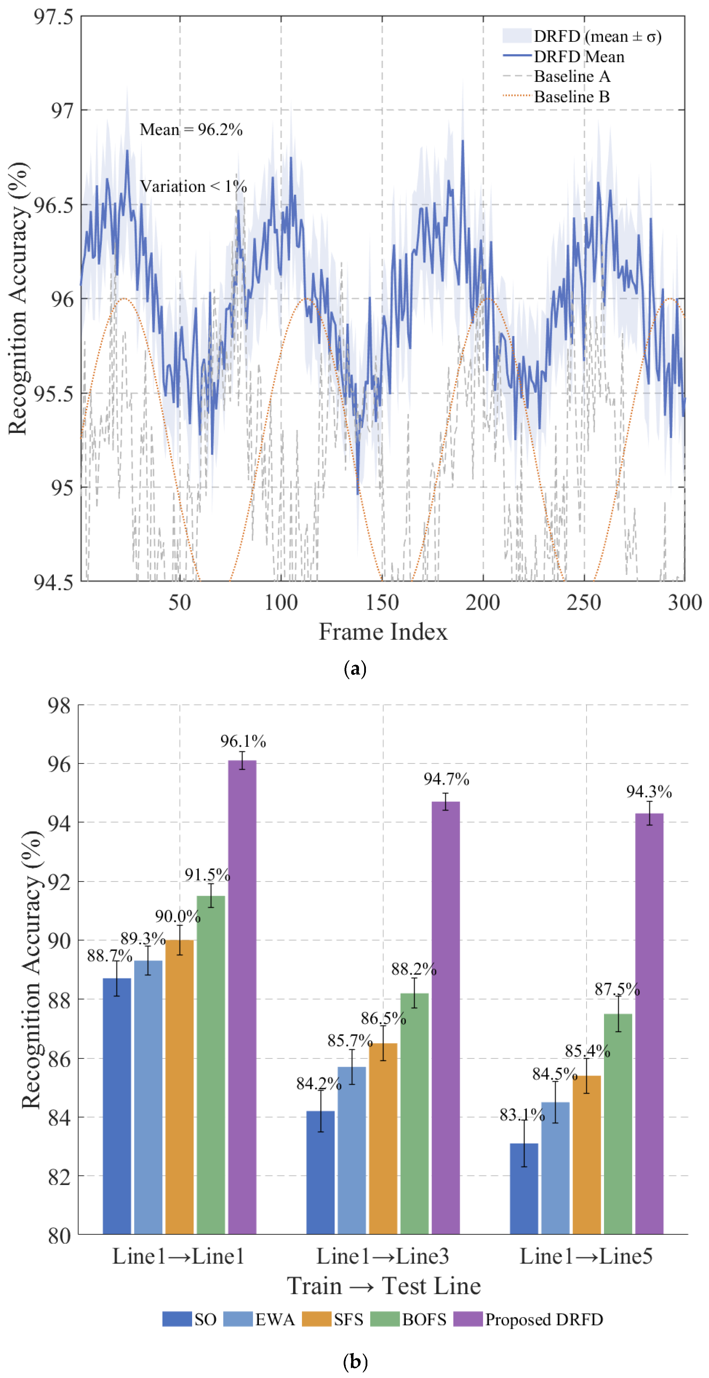 Table 7 reports the recognition accuracies obtained by DRFD and four baseline methods (SO, EWA, SFS, BOFS) across five representative train–test configurations. The results demonstrate that DRFD consistently achieves the highest cross-line recognition accuracy, maintaining above 94% accuracy even when applied to unseen railway lines (e.g., Line 1 → Line 3, Line 1 → Line 5, and Line 5 → Line 3).