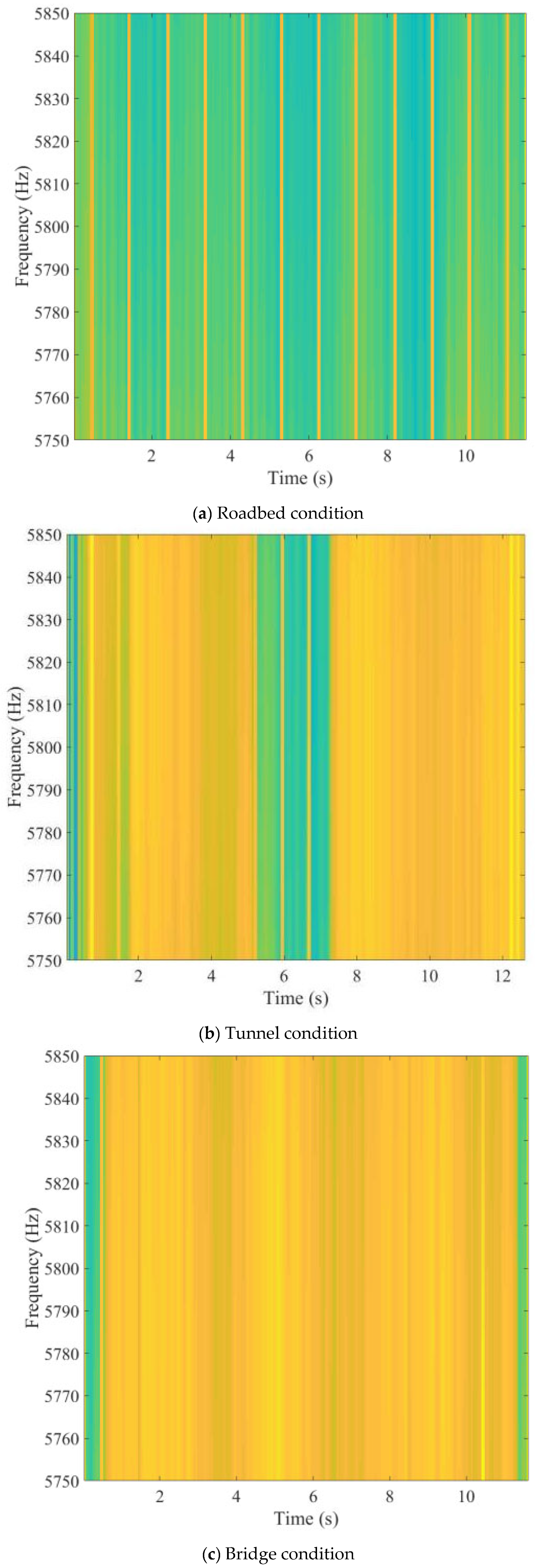 Transition Conditions (Tunnel → Roadbed and Bridge → Roadbed): In the initial segment of the signal, the spectra exhibit unstable, broadened ridges that gradually converge into a narrowband pattern as the environment transitions to the roadbed.
