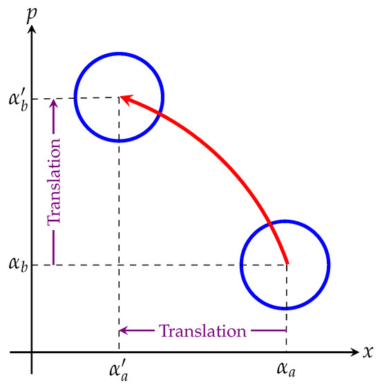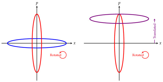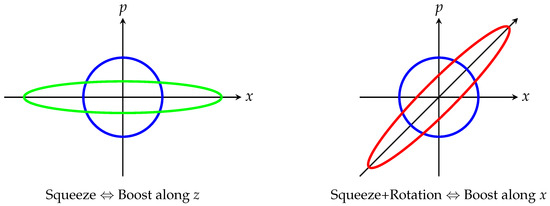 for the augmented coordinate system as in Equation (16). The elongation along the x axis necessarily yields to the contraction along the p axis to preserve the area in the phase space. For the squeeze along the direction, we use from Equation (19), so we have