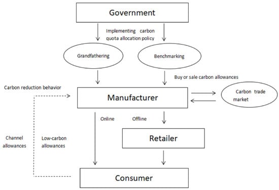 The current research focuses on supply chain management under the government’s carbon quota allocation policy and dual-channel supply chain channel selection against the background of carbon quota trading. Benjaafar and his colleagues (2012) first discussed the impact of carbon trading on supply chain operations and management under government carbon allocation policies; they found that the existence of carbon regulation can significantly increase the value of supply chain collaboration [3]. Zhang Lihao and his colleagues (2019) studied supply chain strategy selection under the consideration of carbon quotas and trading mechanisms, carbon emission reduction technology input, and consumers’ low-carbon preferences [4]. Wang et al. (2019) examined the impact of carbon quota policies on supply chain members to verify the effectiveness of government carbon quota policies [5]. Jin Yanxin et al. (2025) studied the impact of manufacturers’ channel encroachment on supply chain profits, sales volume, and carbon emissions under the carbon trading mechanism, considering consumers’ low-carbon preferences and advertising strategies [6]. Wang et al. (2020) studied supply chain production and carbon reduction strategies based on carbon policy regulation [7]. Xia Xiqiang and his colleagues (2024) studied the impact of government subsidies on original manufacturers and remanufacturers in a closed-loop supply chain under two different carbon allocation modes: the historical emission method and the baseline method [8]. Xu Jianteng et al. (2023) analysed the historical method and baseline allocation of carbon allowances under the business of a robust emission reduction strategy [9]. Zhu et al. (2024) constructed game models to analyze the impacts of the grandfathering mechanism and benchmarking mechanism on corporate emission reduction, benefits, and the environment in the authorized remanufacturing supply chain [10]. Guo et al. (2025) explored the impacts of e-commerce platform mode (agency, manufacturer-led/reselling, platform-led reselling) and carbon quota allocation mechanism (grandfathering, benchmarking) selection on manufacturers’ optimal decisions, supply chain coordination, and social welfare under the cap-and-trade scheme with green operations [11]. Ji et al. (2017) compared the impact of historical and baseline approaches on corporate decision-making, profits, and social welfare; the benchmark approach was found to be more effective than the historical approach in motivating manufacturers to produce low-carbon products and in motivating retailers to promote low-carbon products [12]. Han Xiaoya et al. (2024) found that carbon caps, trade policy, and consumer awareness of environmental protection significantly impact the choice of business marketing model [13]. Wang Kai et al. (2023) found that different government policies on carbon allocation would affect the determination of optimal supply chain policies [14]. Leimin et al. (2024) found that firms using the benchmark approach make more profits when factors change than those using the grandfathering (historical emission method) approach and are more stable in market competition [15]. Existing studies have focused on the carbon reduction behaviour and production decisions of manufacturers and retailers in a single-channel supply chain under the government’s carbon quota allocation mechanism; there is little consideration of the impact of consumer channel preferences on a dual-channel supply chain subject to different government carbon allocation mechanisms when the supply chain opens up online channels. In the study of channel selection in a dual-channel supply chain in the context of carbon quota trading, Zhang et al. (2017) [12] studied the emission reduction behaviour of supply chain members in the retail channel and dual channel situations when considering both cap-and-trade regulation and low-carbon preferences of consumers, and they found that joint emission reduction strategies were more beneficial to both manufacturers and retailers. Yang et al. (2014) [16] studied the impact of low-carbon policies on channel coordination in a two-echelon supply chain consisting of one supplier and one retailer. Previous studies have analyzed and compared the impacts of four low-carbon policies on channel coordination: the basic model, carbon emission model, carbon emission trading model, and carbon tax model. Yang Shihui and others (2017) have studied the impact of the cost of carbon emissions and manufacturers’ investment in carbon reduction on a two-channel low-carbon supply chain dominated by manufacturers; it was found that the carbon emission cost per unit product sold in traditional retail channels determines the existence of a dual-channel supply chain [17]. Sun Jiannan and others’ (2018) comprehensive considerations of low-carbon consumer and channel preferences seek a low-carbon supply chain optimal emission reduction boundary [18]. Zhang and his colleagues (2023) have studied how hard it is to reduce emissions in a two-channel supply chain and how to make optimal decisions on channel selection with the goal of profit maximization. Manufacturers can make more profits by opening online channels or investing in carbon reduction, and retailers’ profits are not affected by carbon cap-and-trade policies [19]. Wu Wenqi et al. (2024) found that carbon cap-and-trade policies improved the profitability of the power battery recycling supply chain [20]. Zhang Danlu et al. (2024) compared the impact of the carbon trading price and carbon emission coefficient on enterprises’ optimal decision-making [21]. Wang Dao et al. (2024) found that the government’s allocation of carbon allowances to retailers can improve the overall carbon emission reduction benefits of the supply chain [22]. Li Jin et al. (2024) found that only the appropriate carbon price can guarantee the promotion of manufacturers to achieve optimal emission reduction [23]. The