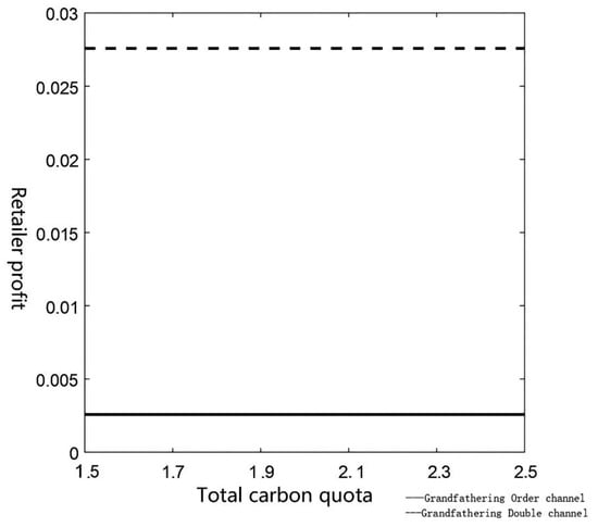 From Figure 2 and Figure 3, we can find that the profits of manufacturers and retailers in the two-channel supply chain under the historical emission method are higher than those of manufacturers and retailers in the single-channel supply chain; this shows that when the government implements the carbon quota allocation policy of the grandfathering allocation, opening a dual-channel supply chain can effectively improve the profit level of each main body in the supply chain. The total carbon allocation under the historical carbon allocation policy has a positive impact on the profits of manufacturers, and the earnings of manufacturers under both single and double channels increase with the increase in the total carbon allocation under the historical method. This is because manufacturers are subject to carbon quotas during the manufacturing process. As the total carbon quota increases, the pressure on manufacturers to reduce emissions decreases, and the costs of reducing emissions decrease accordingly. The prices of the products produced are reduced, consumer demand is increased, and the profits of manufacturers and enterprises are increased. The profits of retailers are not affected by the total amount of carbon allowances under the historical carbon allocation policy; this is because, compared with the unit carbon quota of the baseline method, the historical emission method allocates a fixed total carbon quota according to the carbon emission level of the enterprise in the past period, which is not related to the sales volume of the enterprise’s products in the current cycle. Retailers’ profits are determined by wholesale prices and sales volumes, so they are not affected by the historical total carbon quota. The comparative effects of Model 1 and Model 3 based on different variables are shown in Figure 2 and Figure 3.