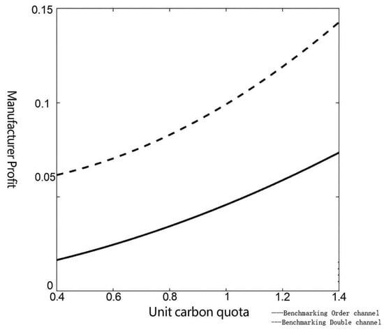 In the two-channel decision-making model of the benchmark method, the optimal profit of the manufacturer is affected by the carbon quota per unit product of the benchmark method and increases with the increase in the carbon quota per unit product of the benchmark method. The proof is as follows: