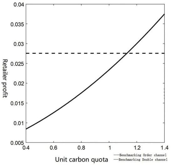 From Figure 4 and Figure 5, it can be found that, when the government implements the carbon quota allocation policy of the benchmarking allocation, the profit level of the manufacturers and retailers under the single channel increases with the increase in the carbon quota. This is because, with the increase in carbon allowances per unit of product, there is less pressure on companies to reduce emissions, reducing the cost of reducing emissions for supply chain companies and thus making the total cost fall, which in turn reduces the price of products and stimulates consumer demand and increased sales of products, resulting in higher overall profits in the supply chain. Compared to the historical emissions method, the baseline method allocates carbon allowances based on the level of carbon emissions per unit of the product produced by the enterprise. In practice, it also needs to consider the actual sales volume of products, which has an impact on the profit level of retailers. In the two-channel supply chain, the profit level of manufacturers increases with the increase in carbon quota per unit product; the profits of the manufacturers in the two-channel supply chain are higher than those in the single-channel supply chain, which shows that the two-channel supply chain can effectively improve the profits of the manufacturers when the government implements the carbon quota allocation policy. When the unit carbon quota is low, the profit level of the retailers in the two-channel supply chain is higher than that of the single-channel retailers. When > and > 0, the profit of single-channel retailers surpasses that of dual-channel retailers, and the profit gap between single-channel and dual-channel retailers widens as the unit carbon quota increases. This indicates that establishing an online channel supply chain negatively impacts retailers’ profits. The comparative effects of Model 2 and Model 4 based on different variables are shown in Figure 4 and Figure 5.