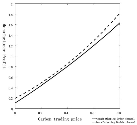 From Figure 6 and Figure 7, it can be found that, when the government implements the carbon quota allocation policy of the grandfathering allocation, the profits of the manufacturers under both single and double channels increase with the increase in the carbon quota trading price. This is because, as carbon prices rise, manufacturers’ carbon management costs rise, but at the same time manufacturers can make a profit by selling their remaining carbon allowances on the carbon market. As carbon prices rise, the marginal cost of reducing carbon emissions falls as the scale of investment in reducing carbon emissions increases. At this point, reducing carbon emissions costs less than the profit from selling the remaining carbon allowances. With the rise in the price of carbon quotas, retailers’ profits under a single channel will decrease and then increase. In the two-channel supply chain, the price of carbon quota does not affect the profit of the retailers. This is because the difference between sales through the offline channel and the wholesale price through the offline channel is independent of the carbon quota trading price. The profits of the manufacturers in the two-channel supply chain are higher than those in the single-channel supply chain, and opening up an online channel can effectively provide manufacturers with profits, which is consistent with the reasoning above. When the price of carbon allowances is low, the profits of single-channel retailers are greater than those of dual-channel retailers; with the increase in the price of carbon trading, the profit of the retailers in the single channel is gradually lower than that of the retailers in double channels, and the creation of online channels does not necessarily increase the profits of retailers. Factors such as the amount of carbon allowances and the price of carbon trading in the carbon market also need to be considered in order to decide whether to open a dual-channel supply chain. The comparative effects of Model 1 and Model 3 based on different variables are shown in Figure 6 and Figure 7.