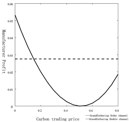 As shown in Table 2, the profit of dual-channel retailers is not affected by the total carbon quota and carbon price, and is only determined by the difference between the wholesale price and the offline retail price. This finding reveals the “carbon policy immunity” characteristic of dual-channel retailers, which provides a theoretical basis for supply chain enterprises to formulate channel selection strategies under carbon emission constraints.